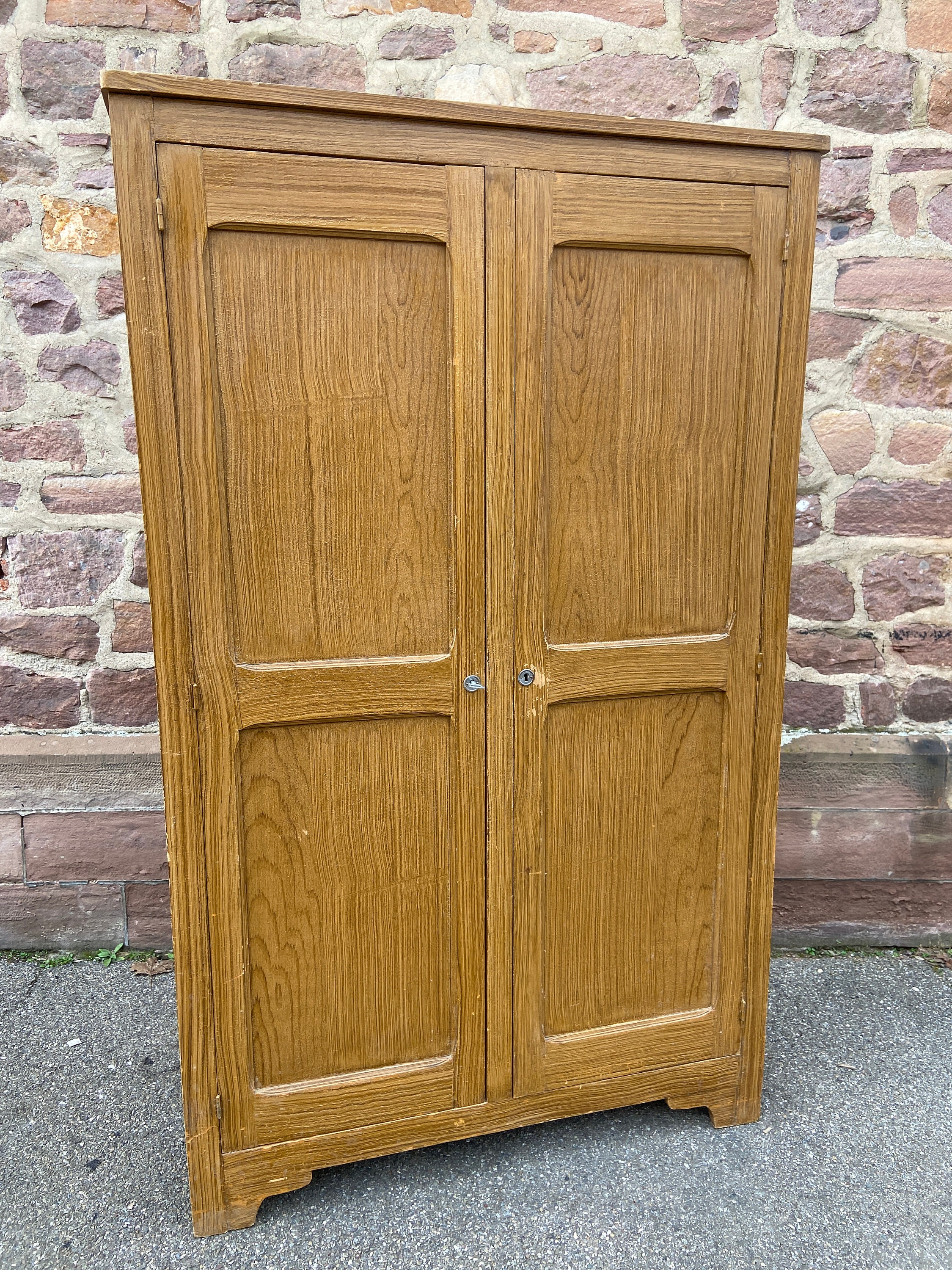Mid-century 2-door wardrobe from the 1950s, wood, old patina with original faux wood style paint..NO...