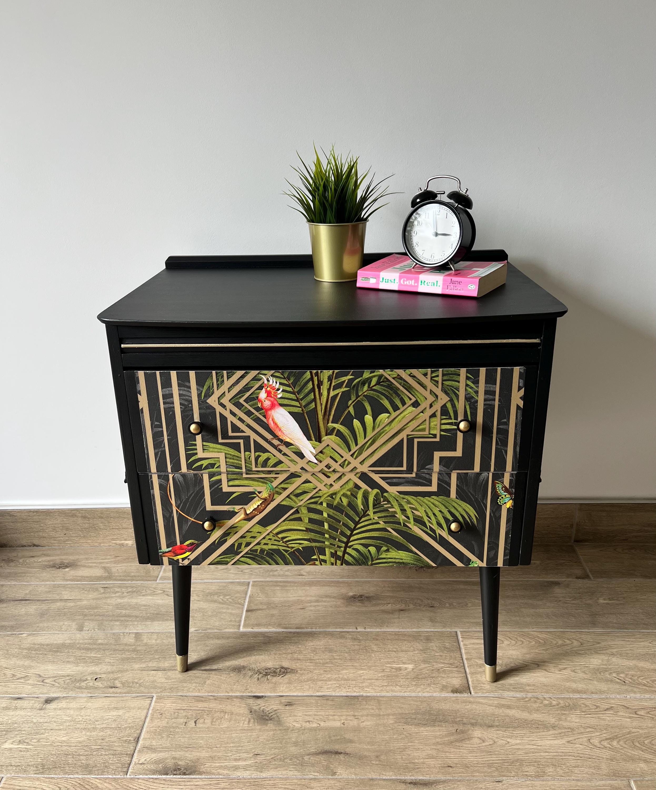 Mid Century Black Bedside Cabinet, Tropical Wallpaper, Gold Accents