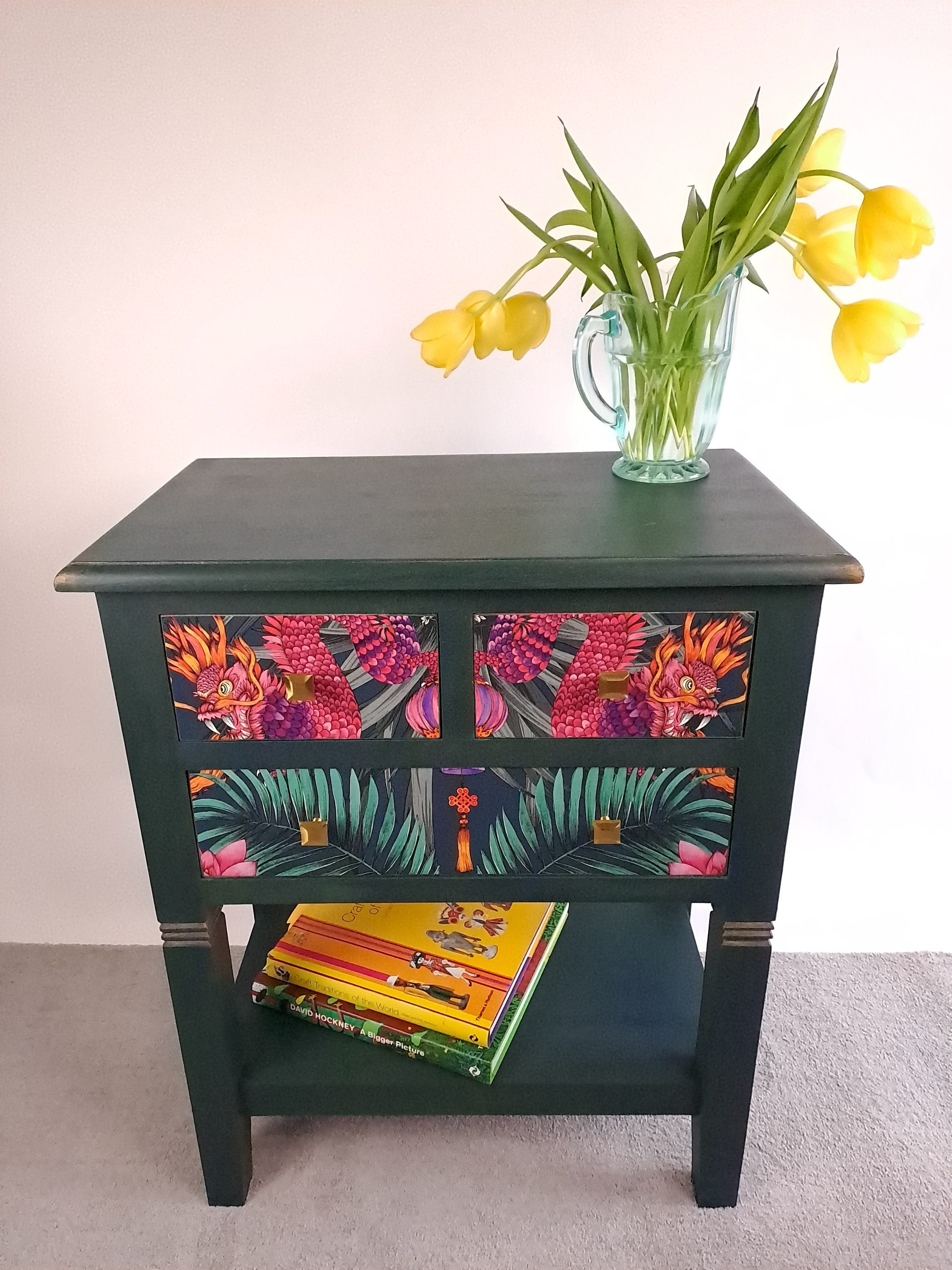 Upcycled vintage hand painted green dresser with pink dragon wallpa...