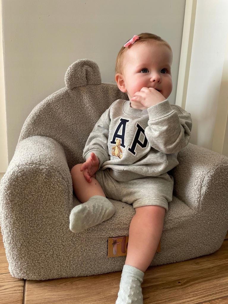 "Foam Armchair for Kids - Personalized with Name - Teddy Boucle Gray with Cute Ears Imagine a c...