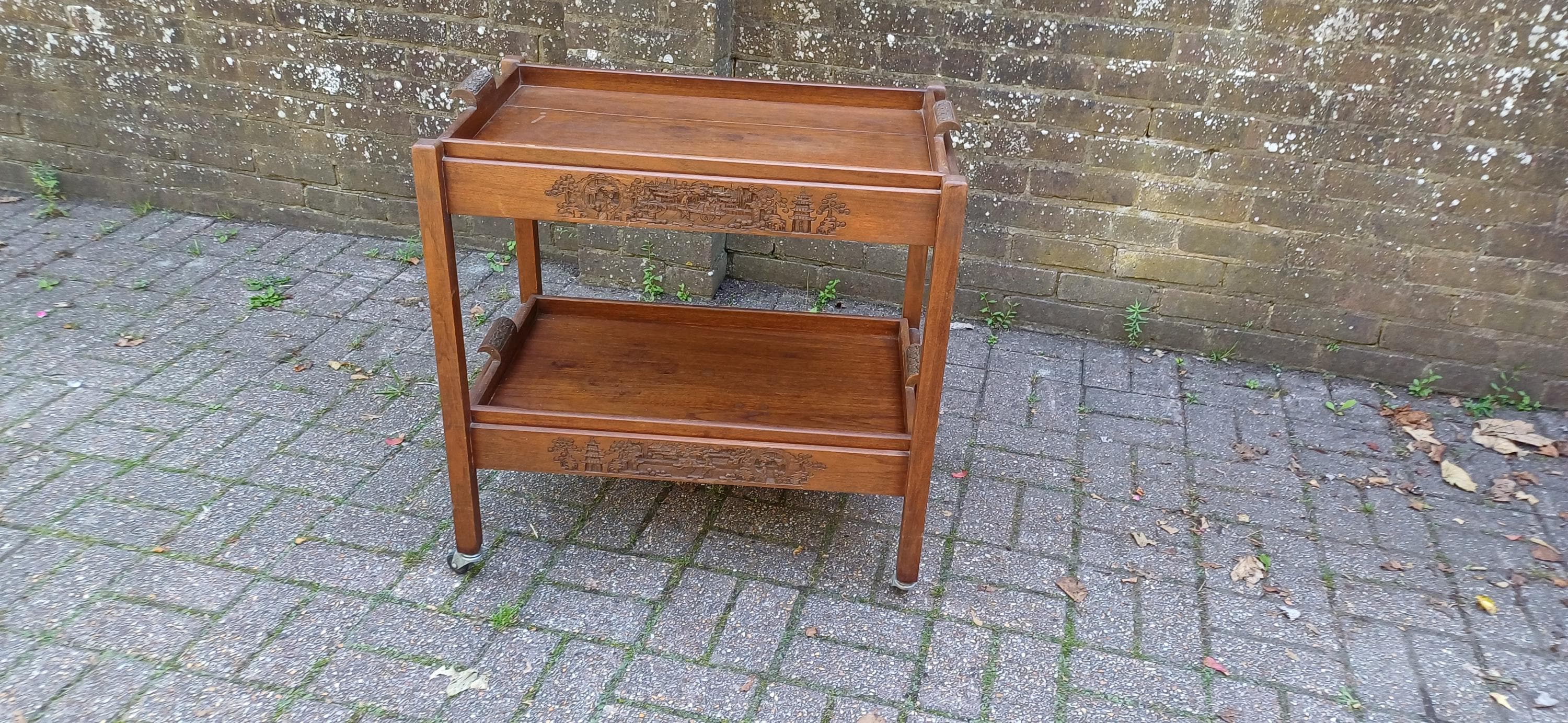 Vintage Mid 20th Century Oriental Carved Trolley Lift Out Trays Fol...
