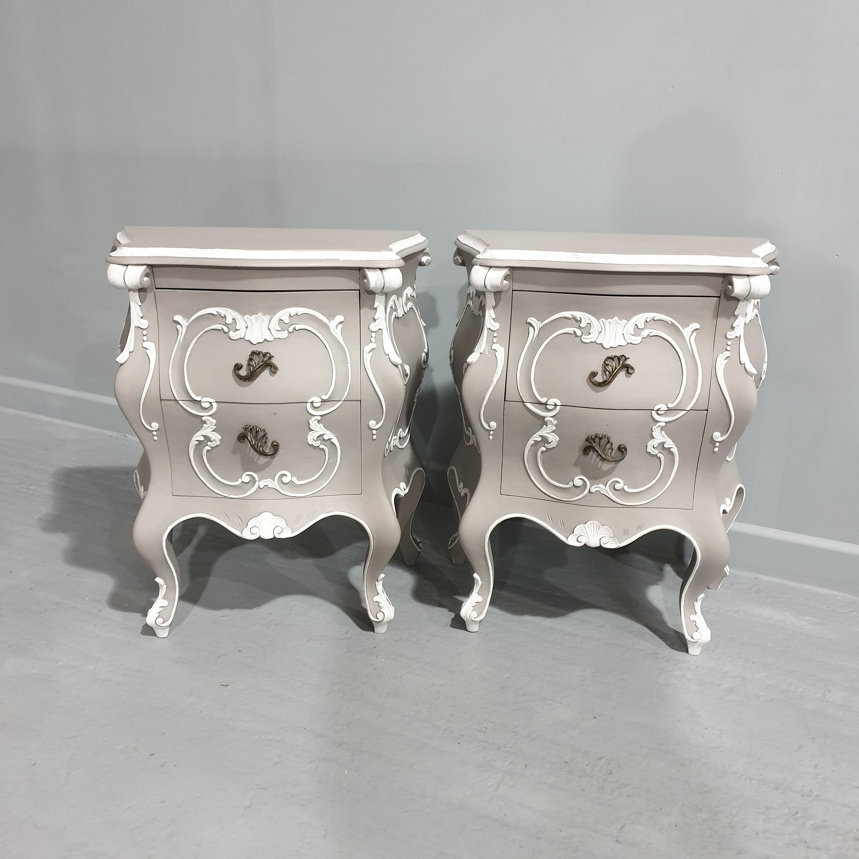 "A very good pair of painted Italian Rococo two drawer bombe shaped bedside lamp chests of draw...