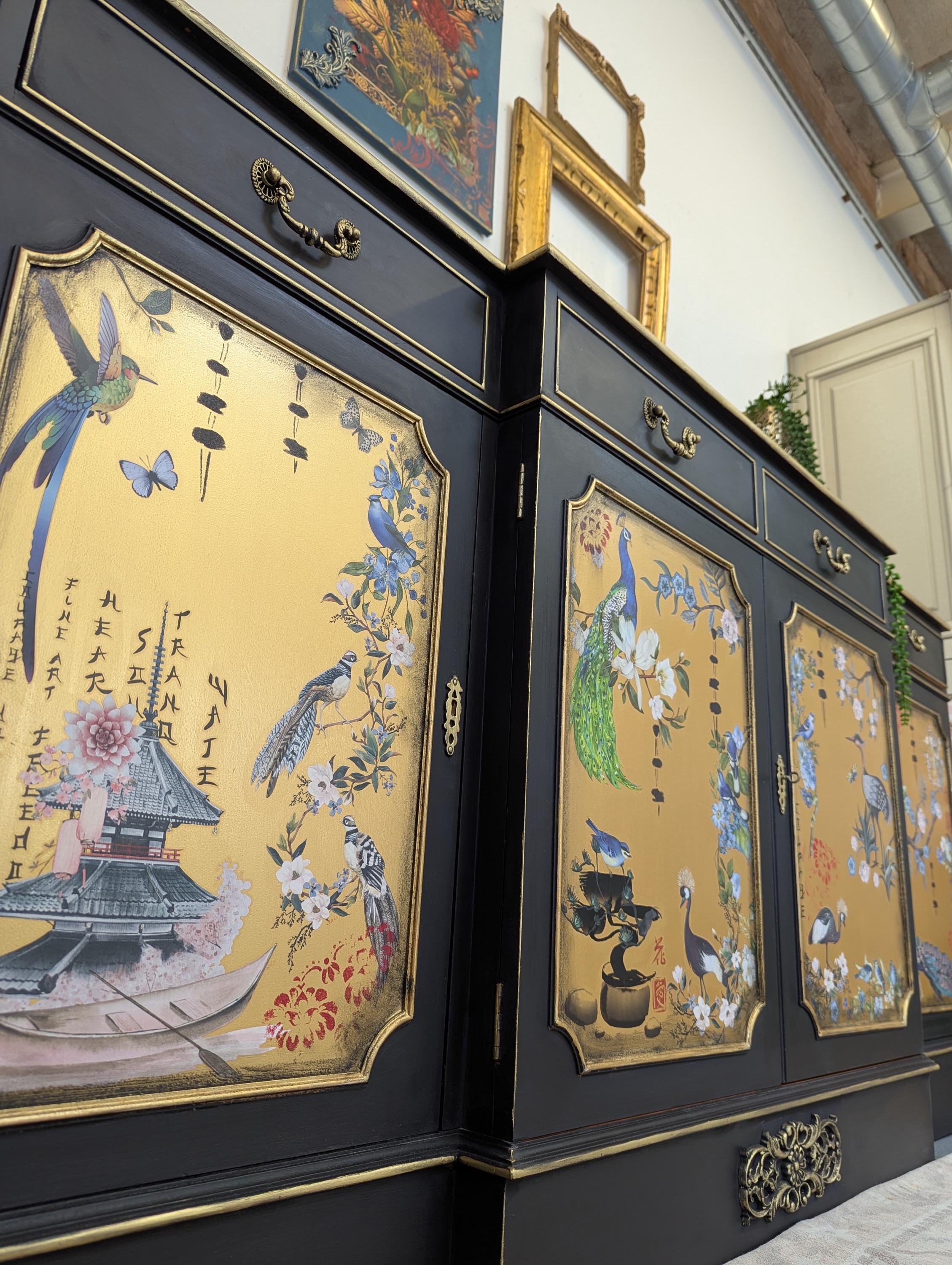 Large black and gold chinoserie sideboards, sourced, upcycled and p...