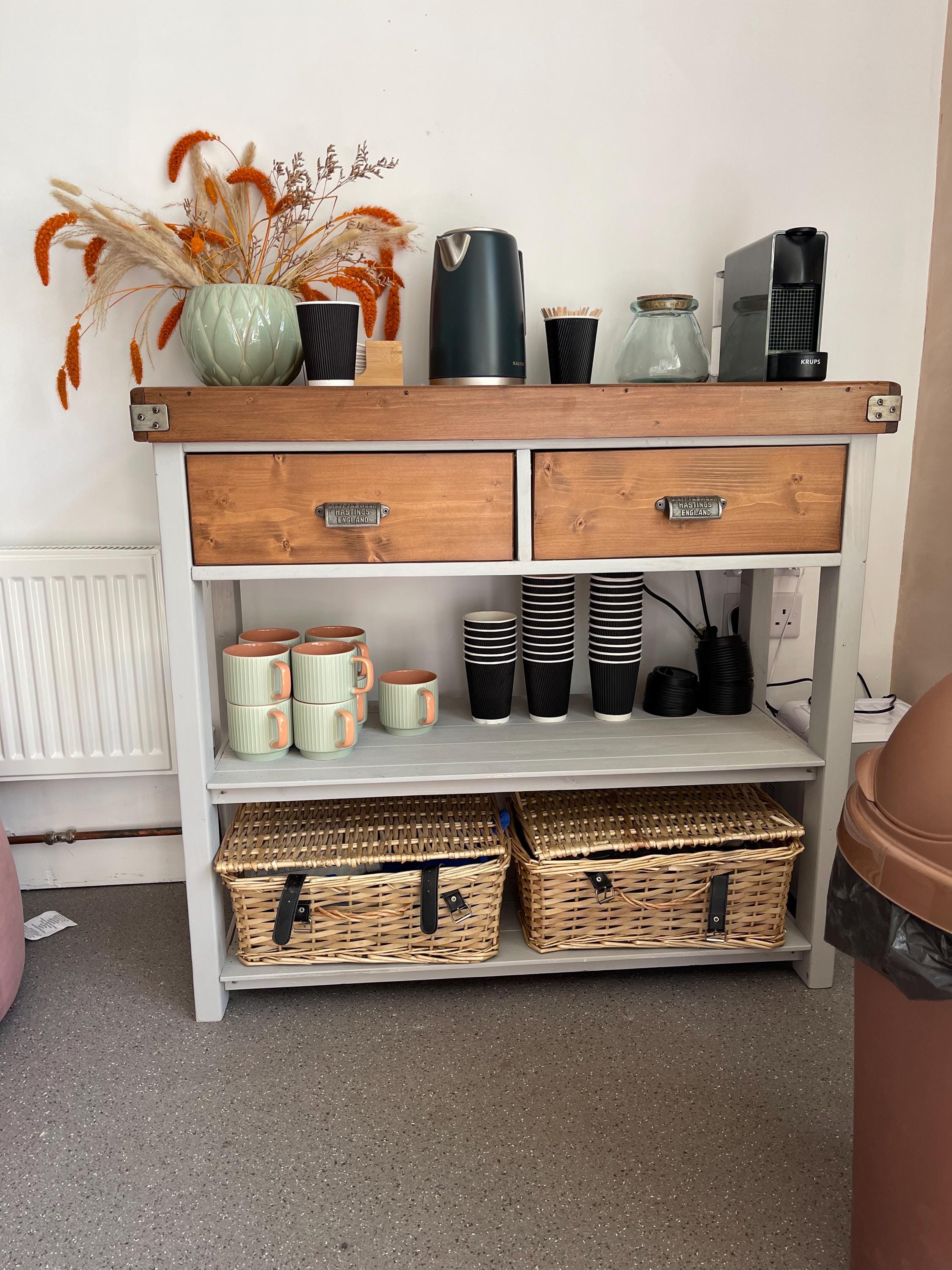This is our rustic pine wood top Butchers block with large double drawer underneath. We can make thi...