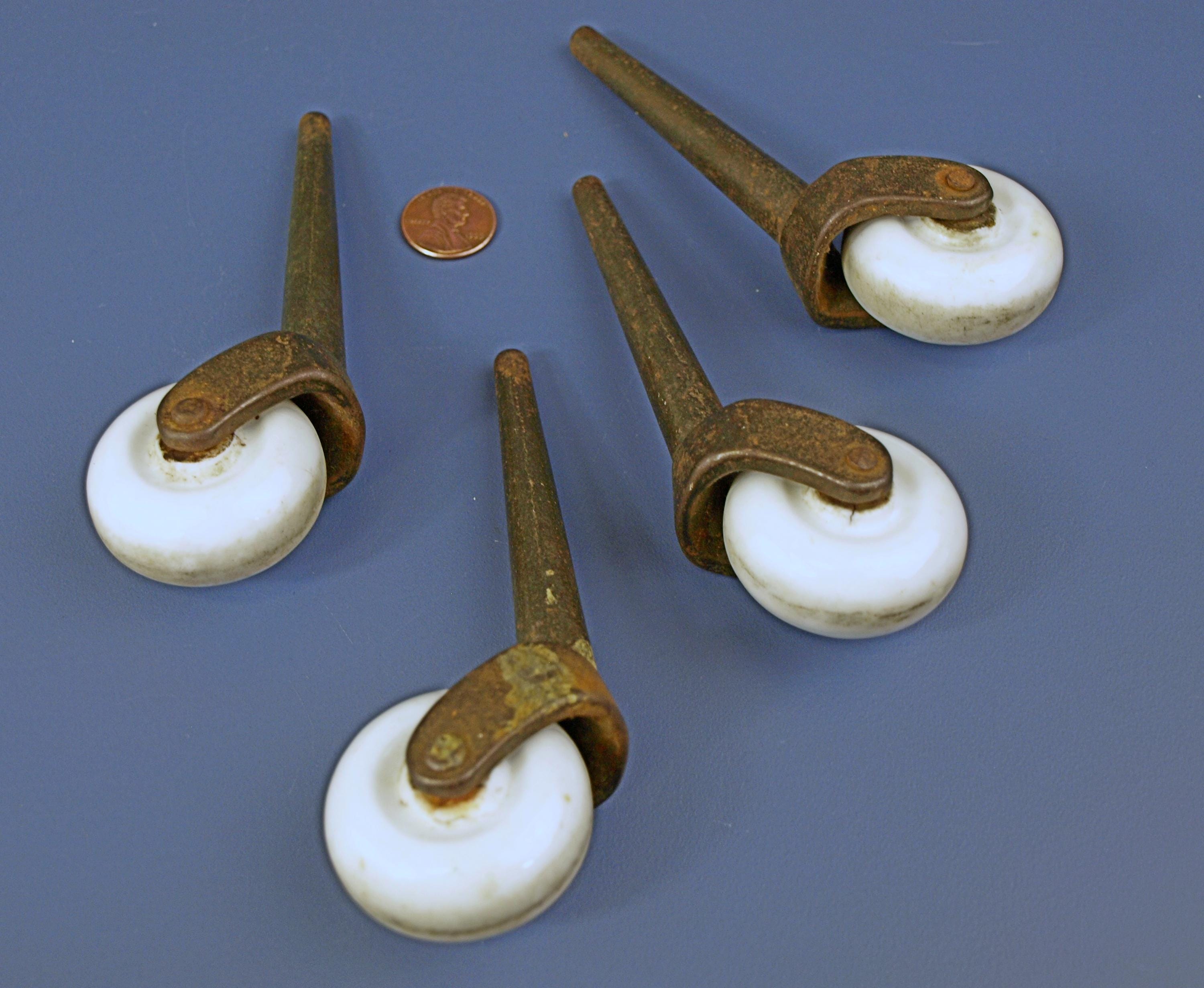 "This is a lot of 4 antique porcelain and steel caster wheels. The porcelain wheels measure 1.5...