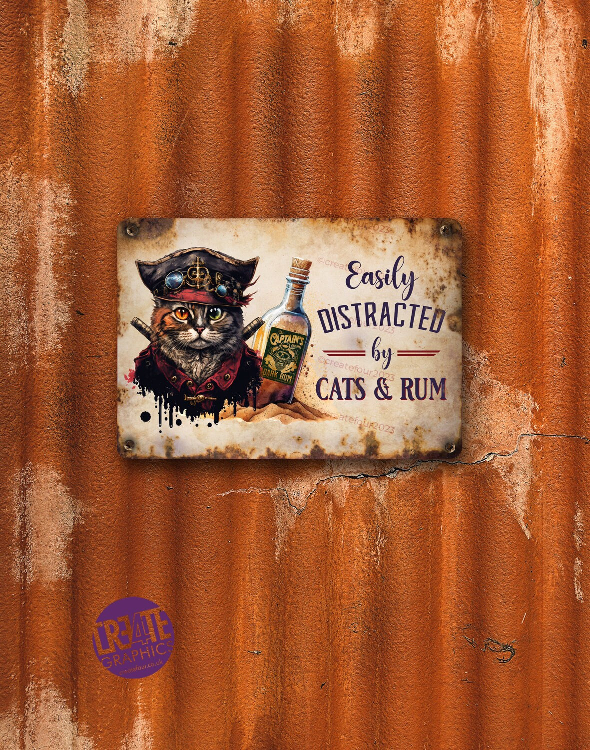Metal sign featuring steampunk cat artwork and the words 'Easily Distracted by Cats & Rum' Great...