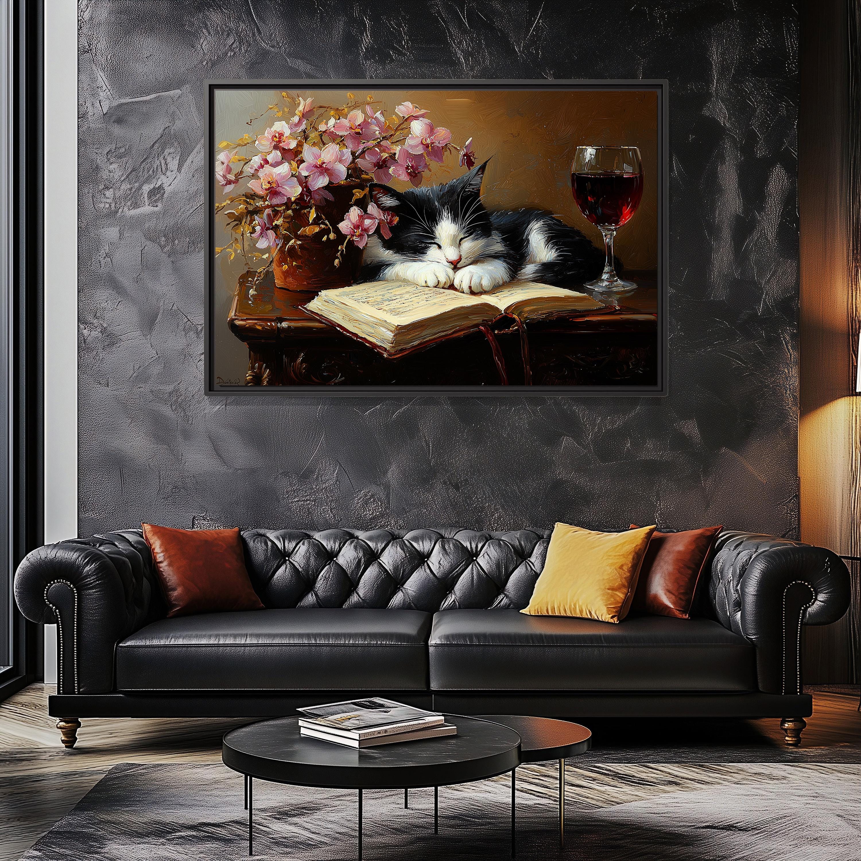 Sleepy Library Tuxedo Cat with Red Wine Print Academia Cat Wall Dec...