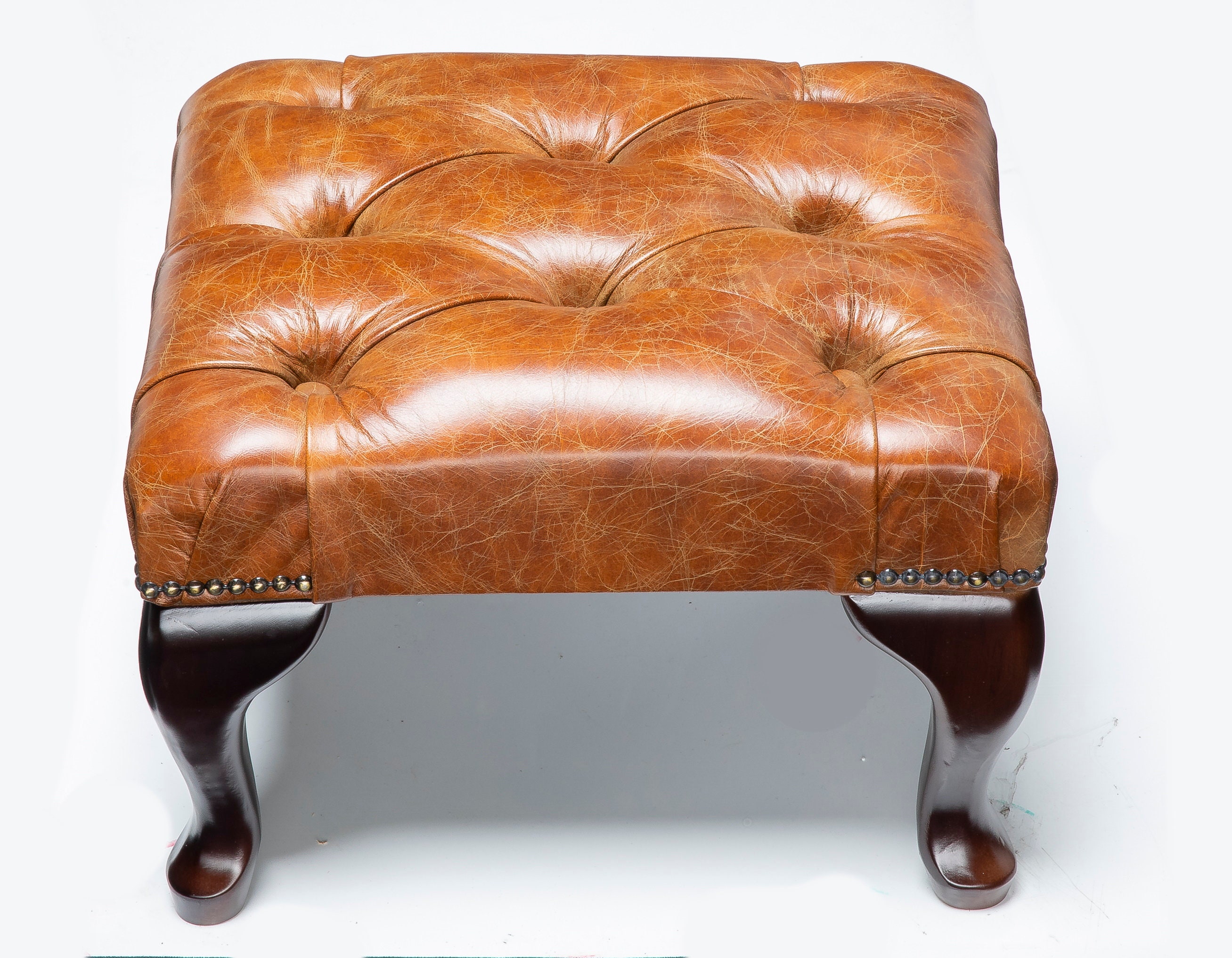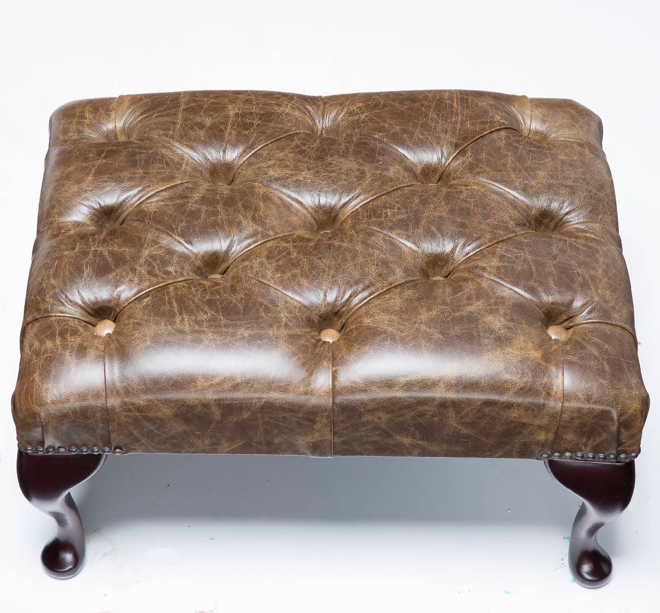 Compact Chesterfield Footstool with Queen Anne Legs. A beautiful handcrafted genuine leather footsto...