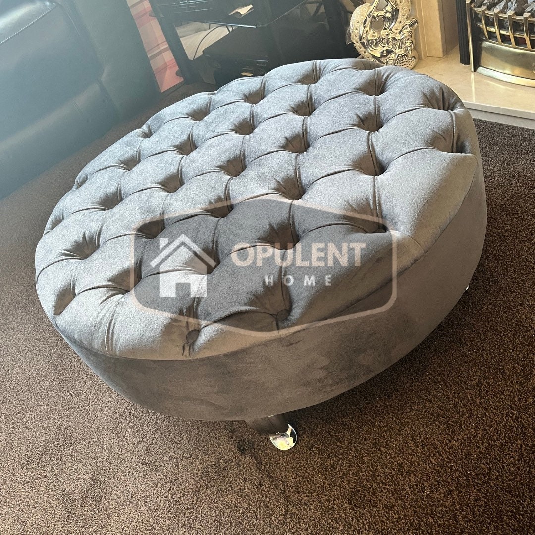 Round Steel Chesterfield Footstool Handmade using premium quality fabric, chipboard and wood. Availa...