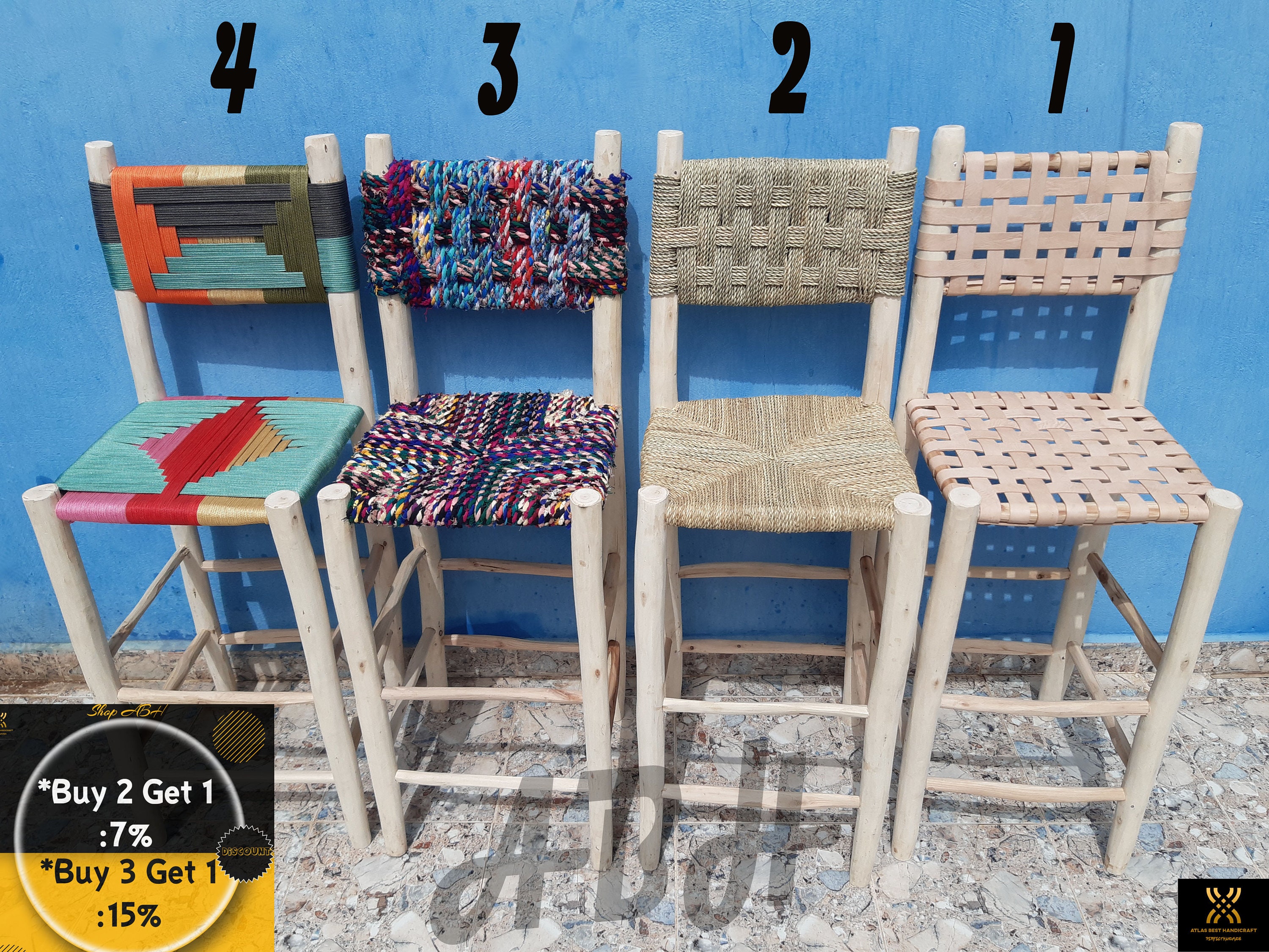 *Buy 2 Get 1:7% / *Buy 3 Get 1:15 100% natural Moroccan wooden bar stool. Handcrafted by our Morocca...