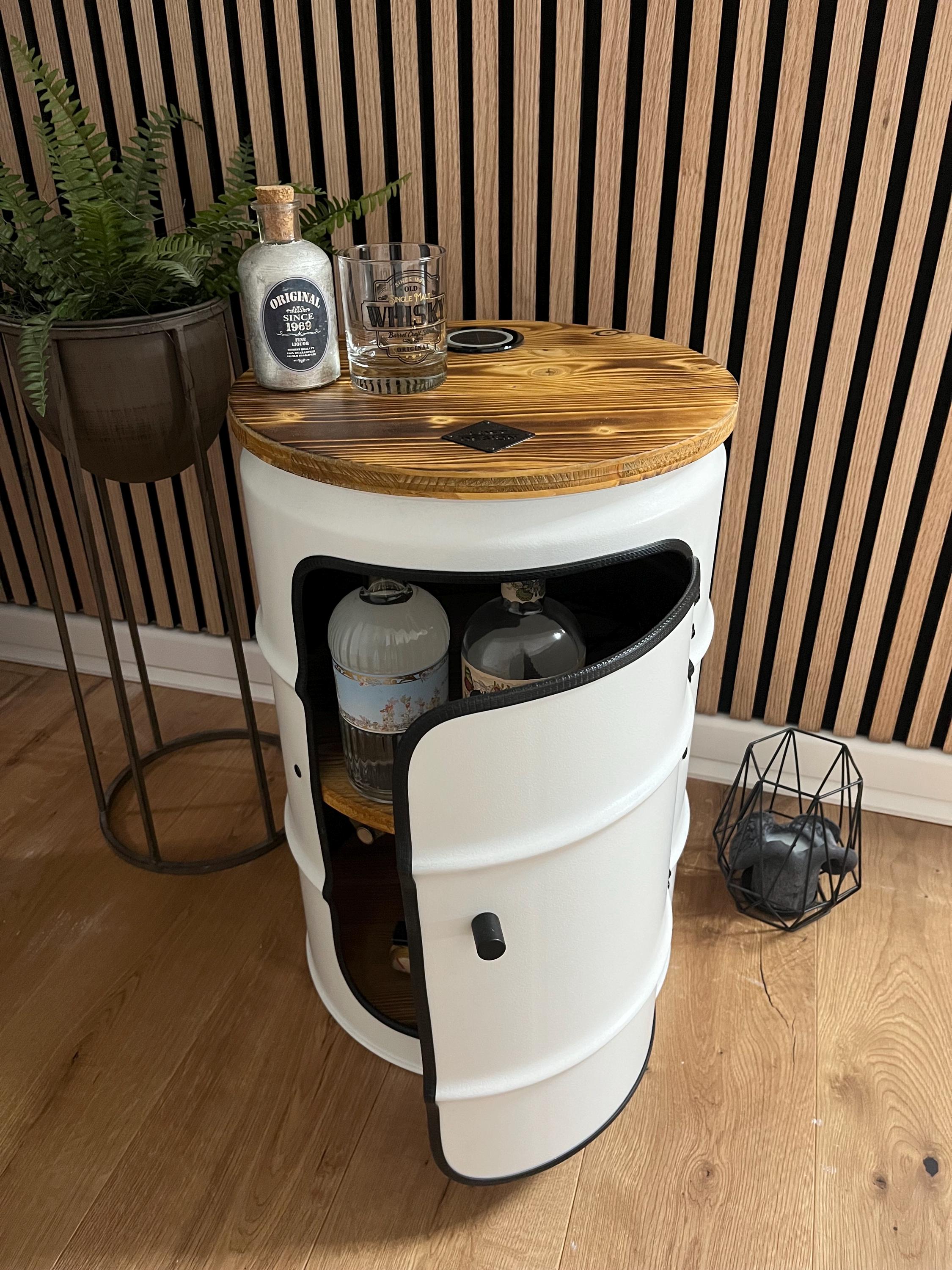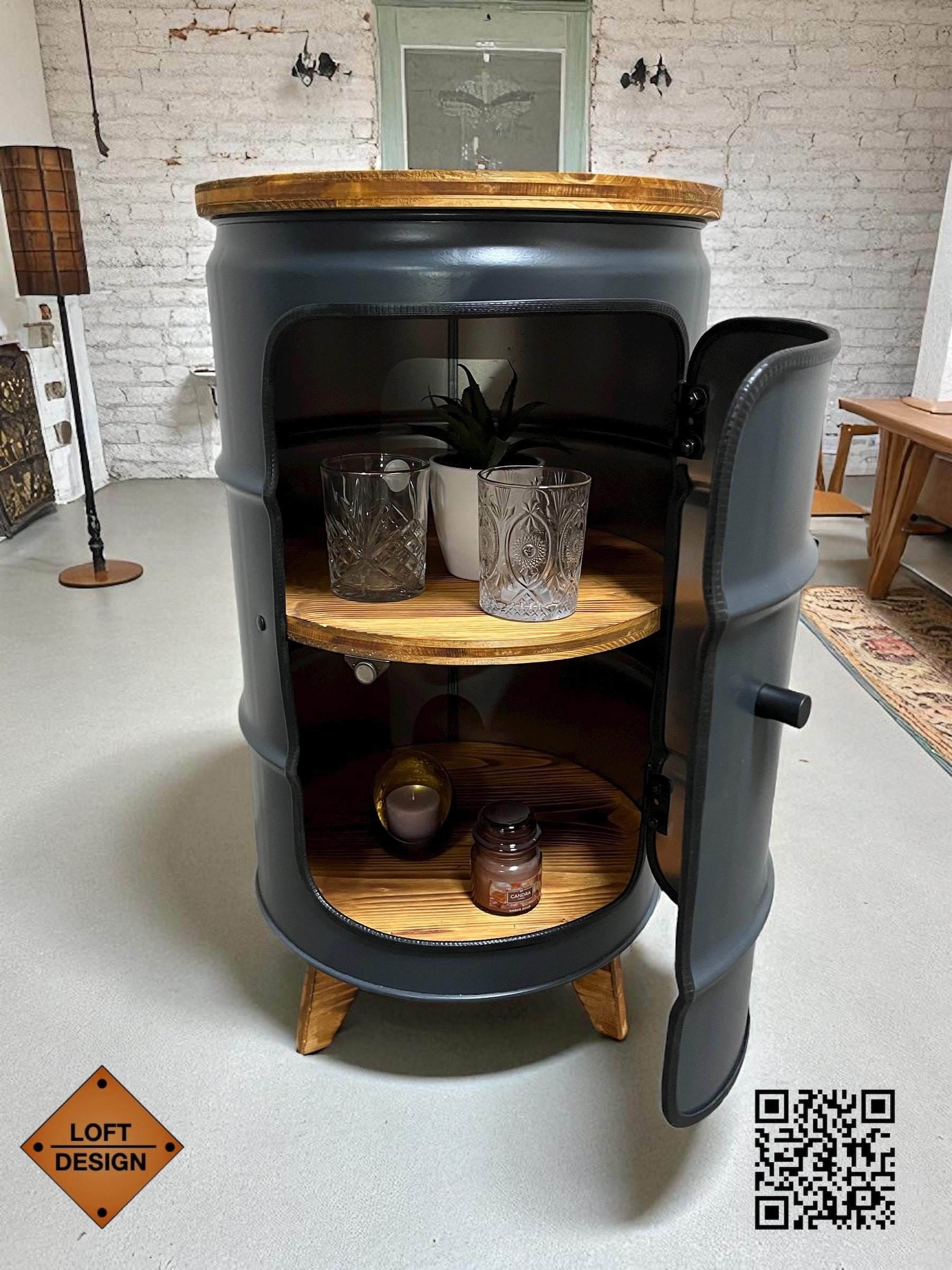 Unique oil drum side table with wooden boards, usable as a bedside ...