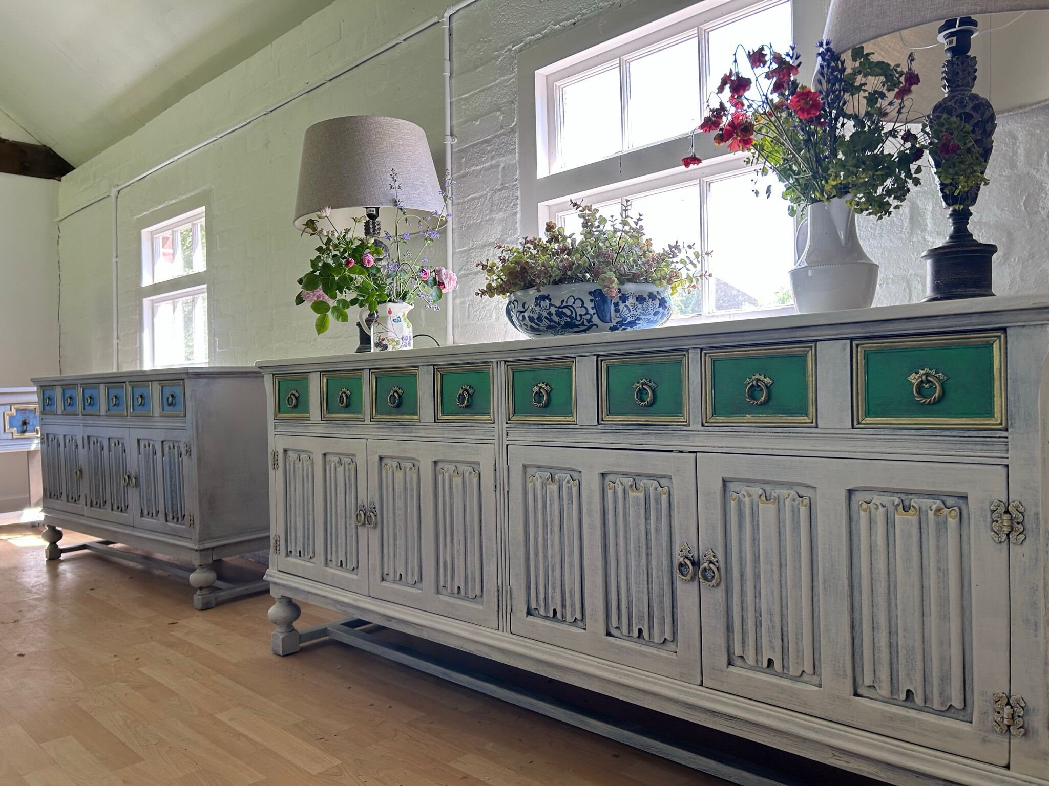 Discover the captivating charm of our Beautiful Green and Off-White Indian Inspired Sideboard, a stu...