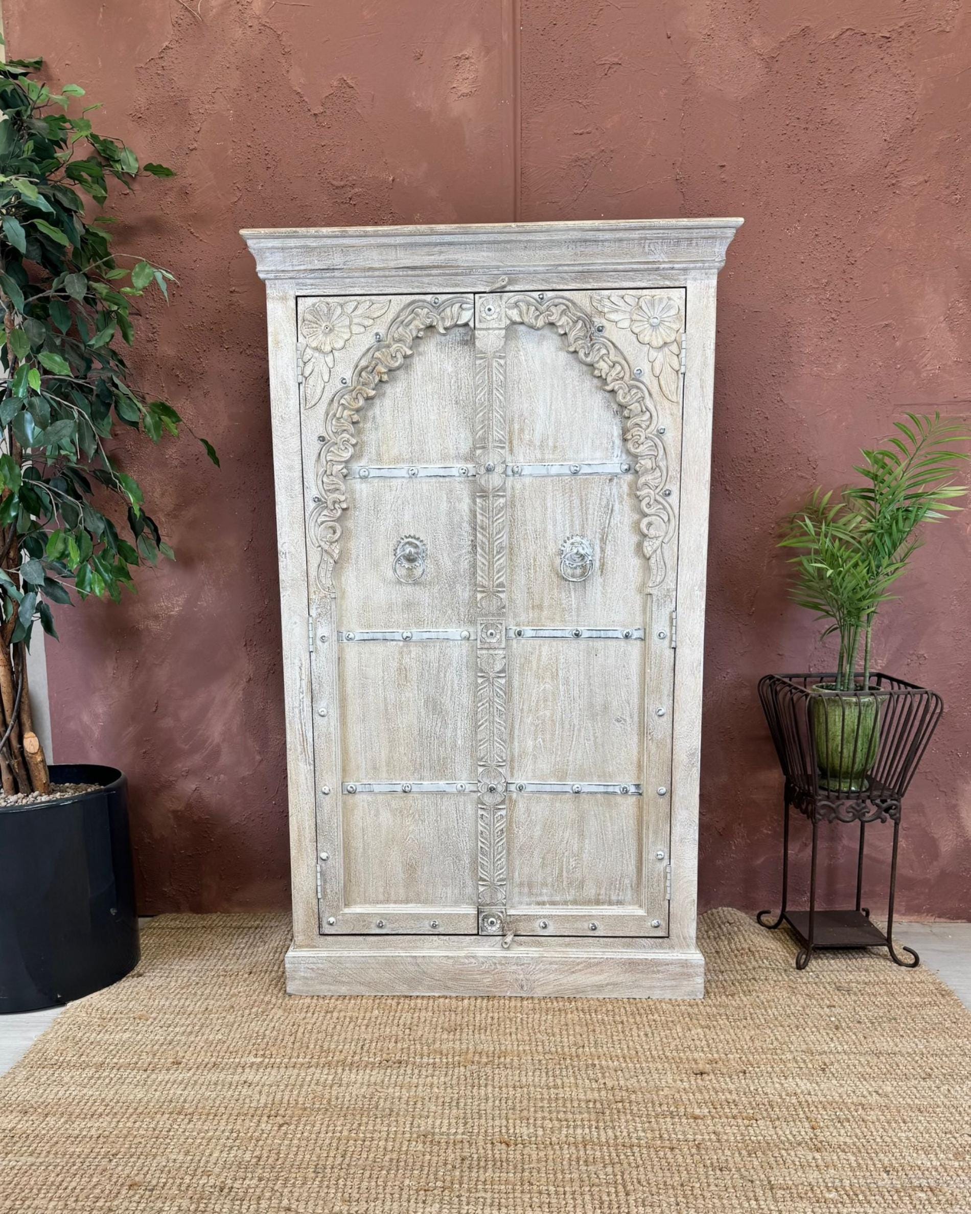 Hand-Carved Mango Wood 2-Door Armoire with Whitewashed Arch Design