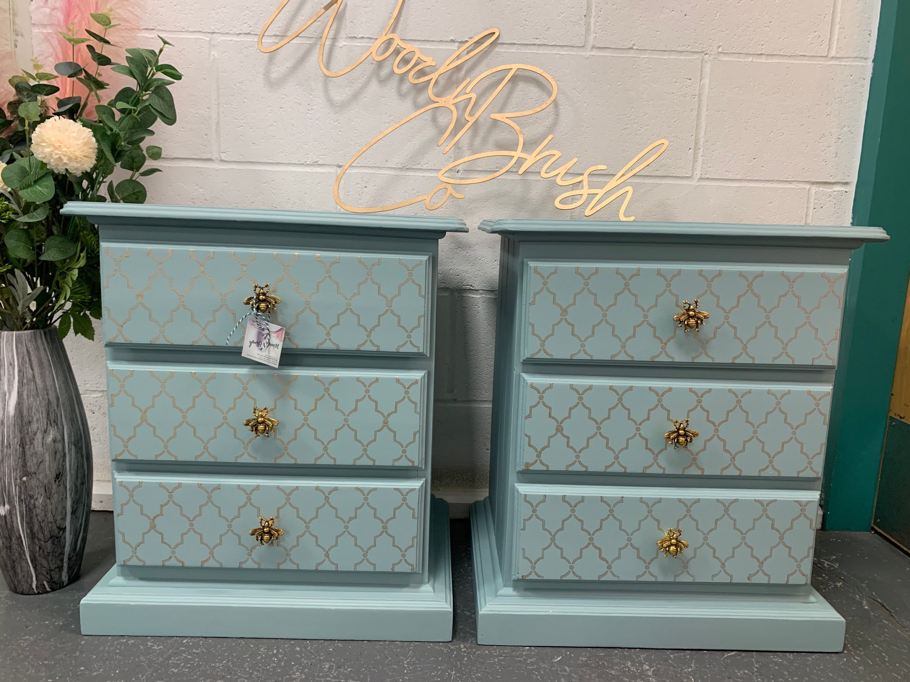 Pair of Painted Bedside Tables Duck egg blue and Gold Morrocan Bee ...