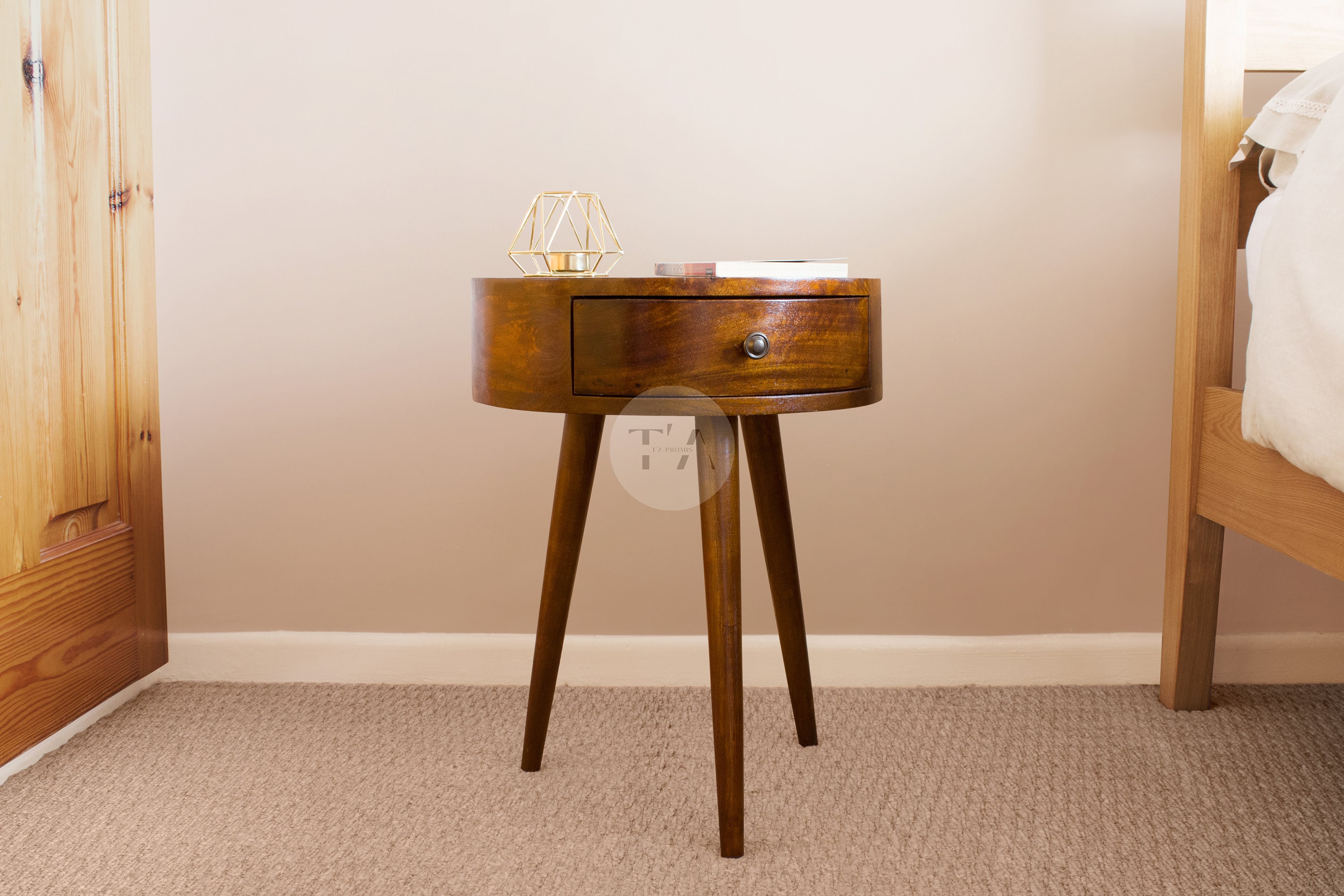Our small round bedside table/bedroom end table with one cute storage drawer and three narrow nordic...