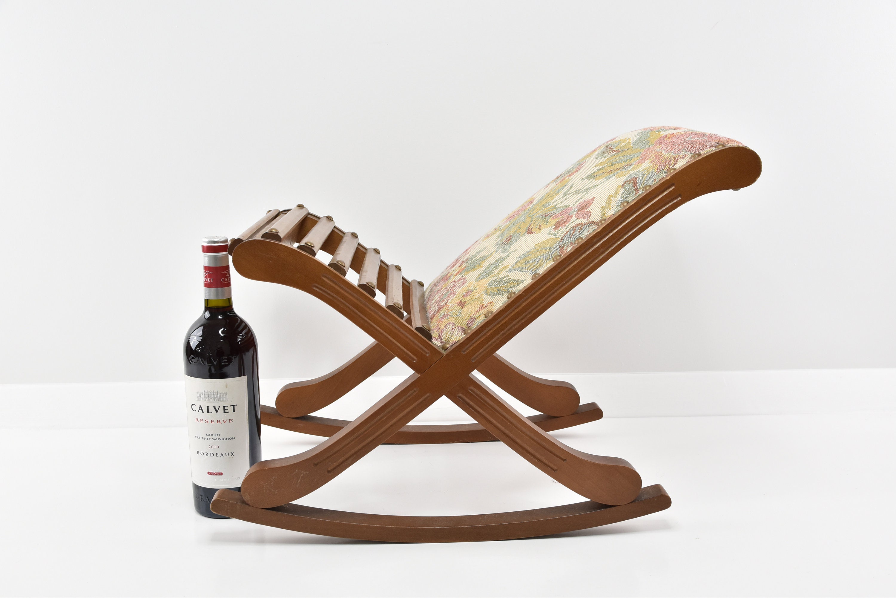 "French vintage wooden slatted and cushioned / cloth rocking footstool, footrest. Condition: In...