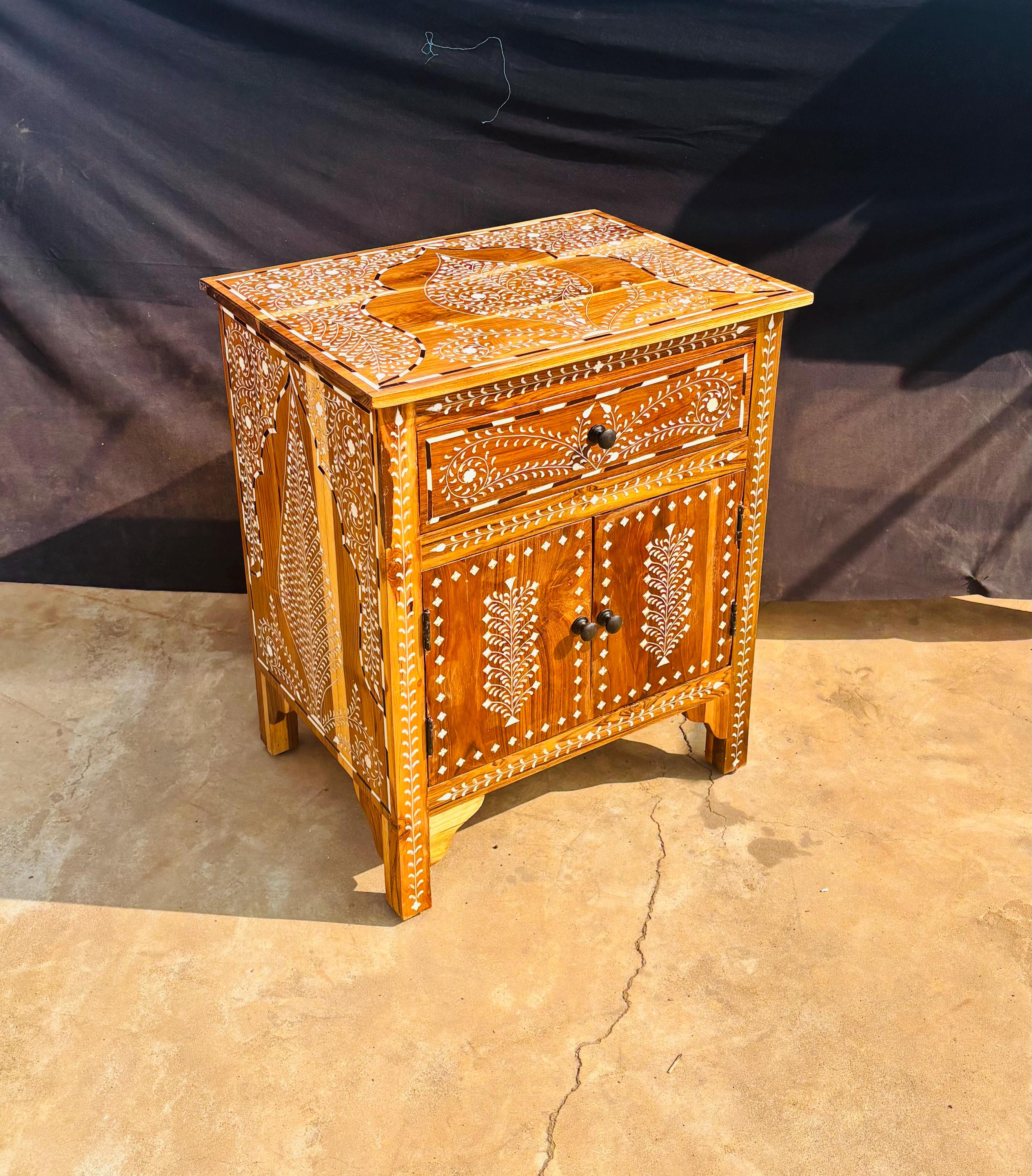 Teak wood Handmade Bone Inlay Bedside Table - Floral Pattern Nights...