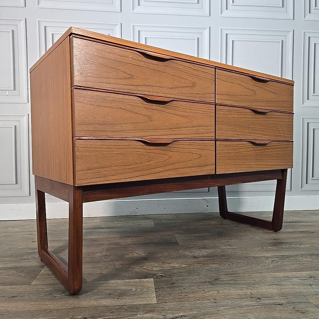 Mid Century Europa Furniture Teak Chest of 6 Drawers on Sleigh Legs A stylish mid century teak chest...