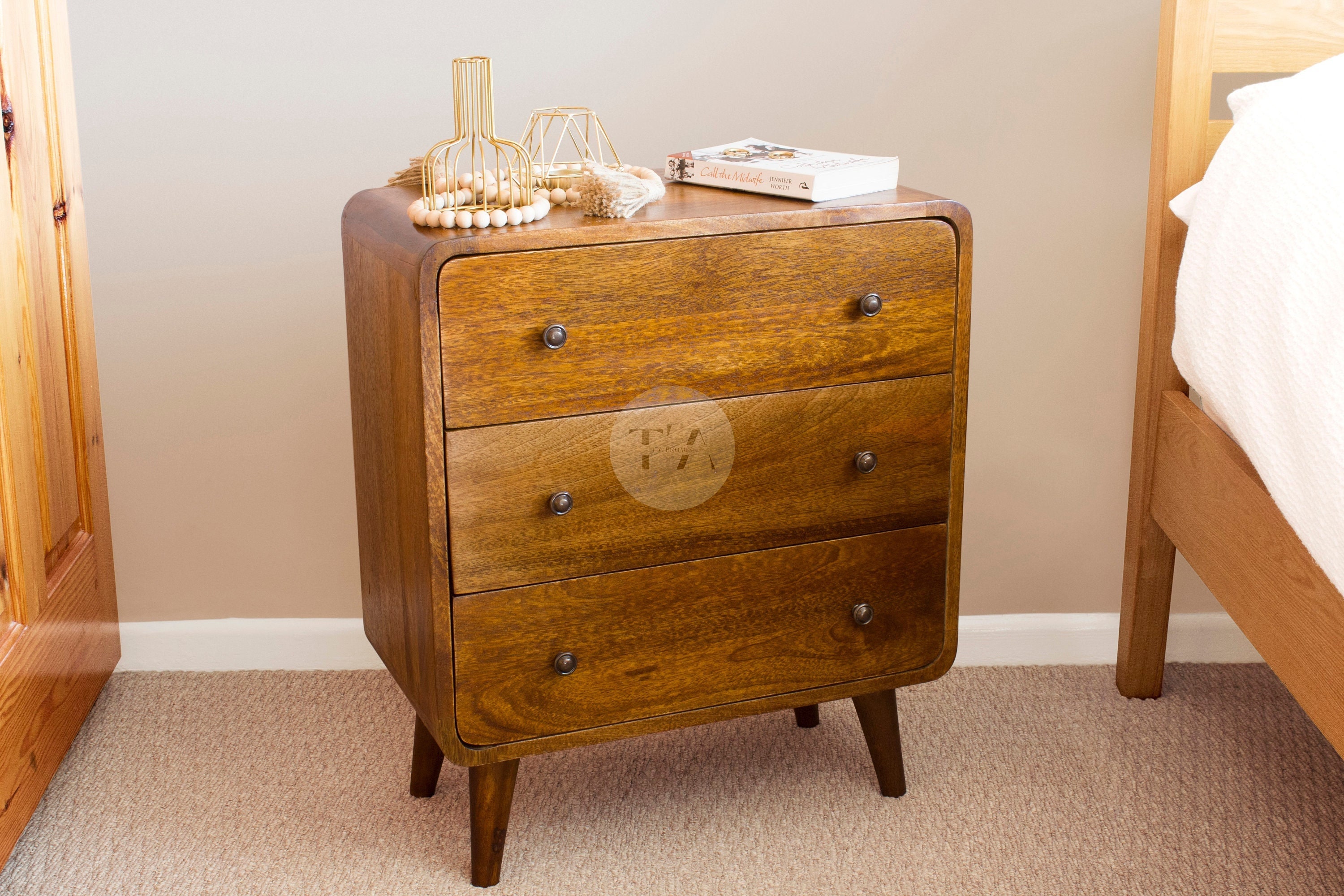 Our extra wide large farmhouse bedside table chest with 3 big storage drawers and cute nordic legs i...