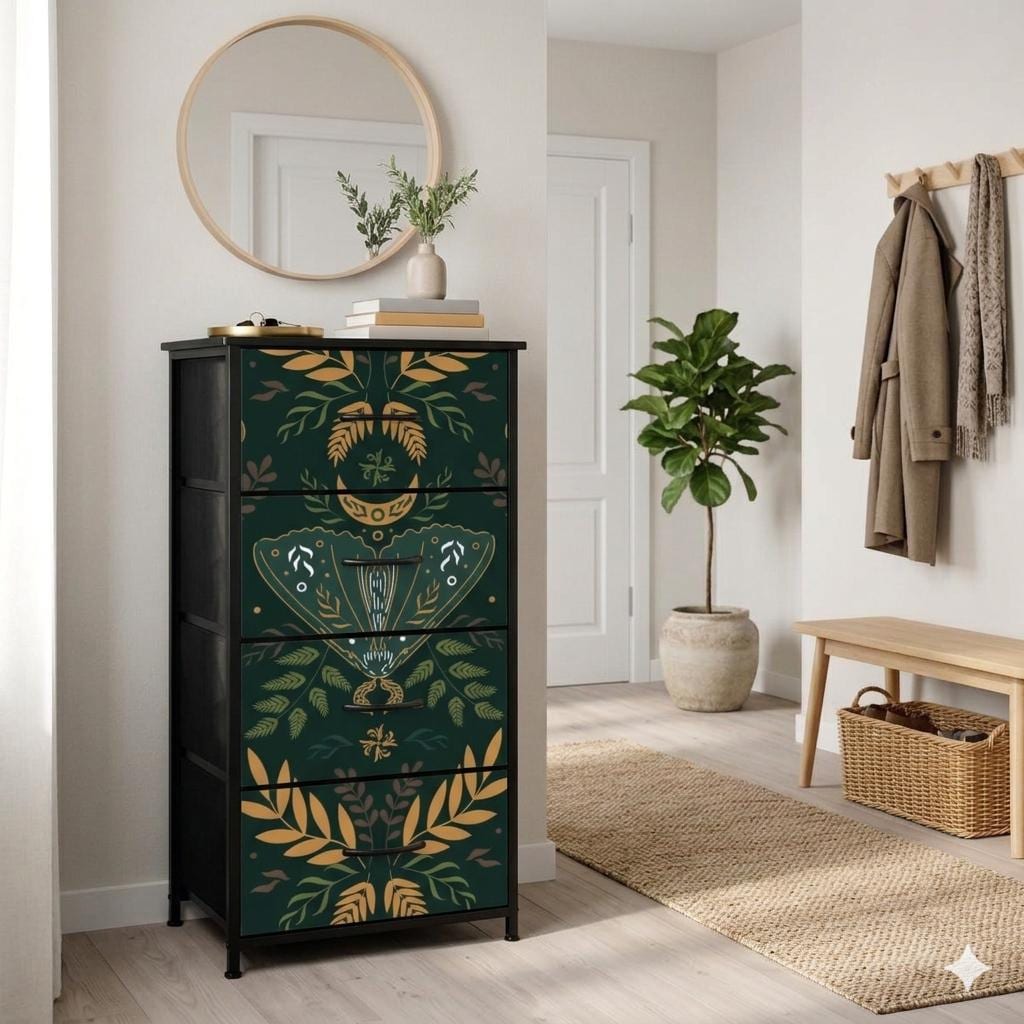 Nordic Folkloric Cottagecore 4-Drawer Dresser: Dark Academia Fabric...