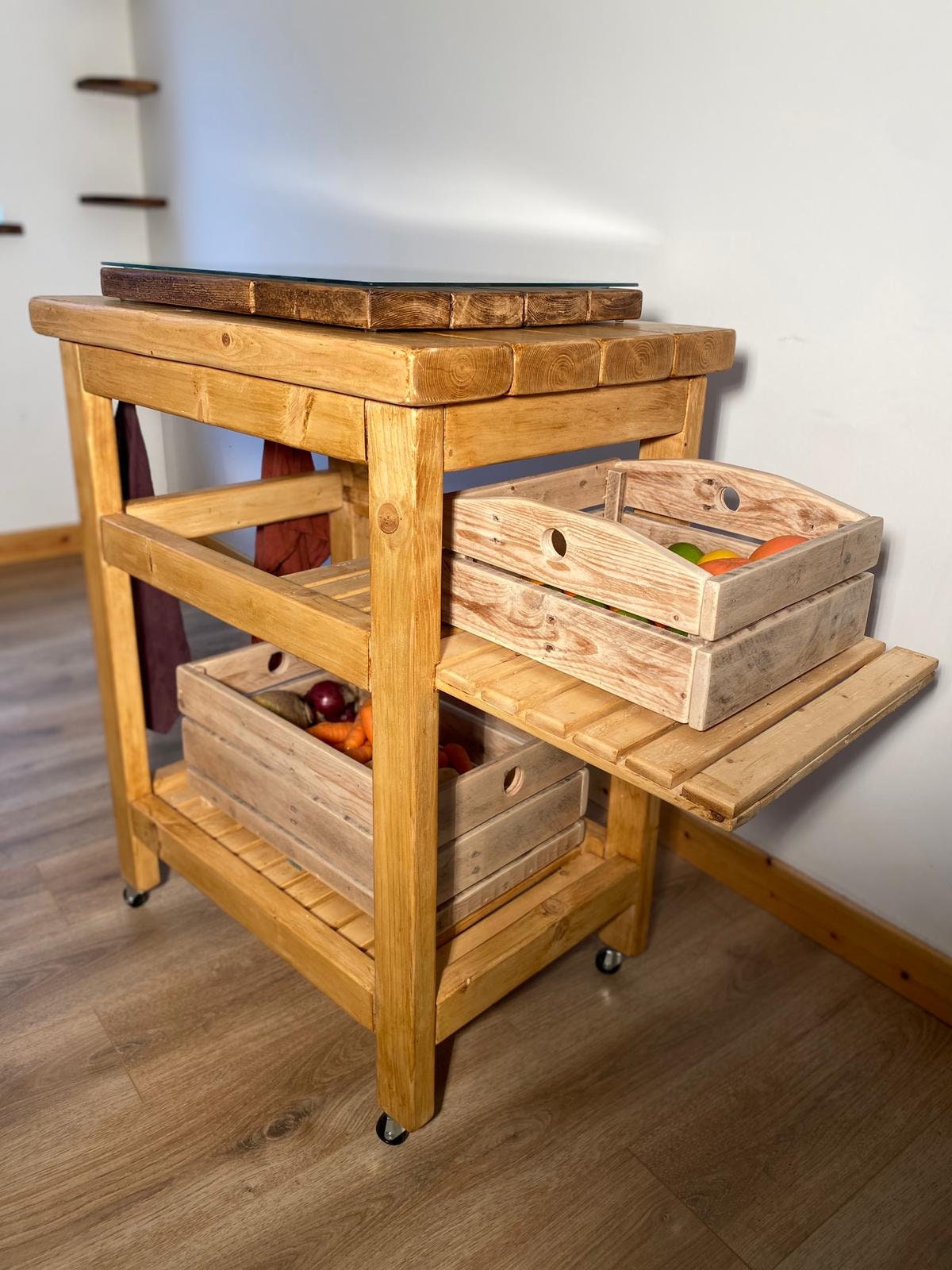 Standout, handmade kitchen trolley crafted from new and sustainable pine wood. Includes sliding shel...