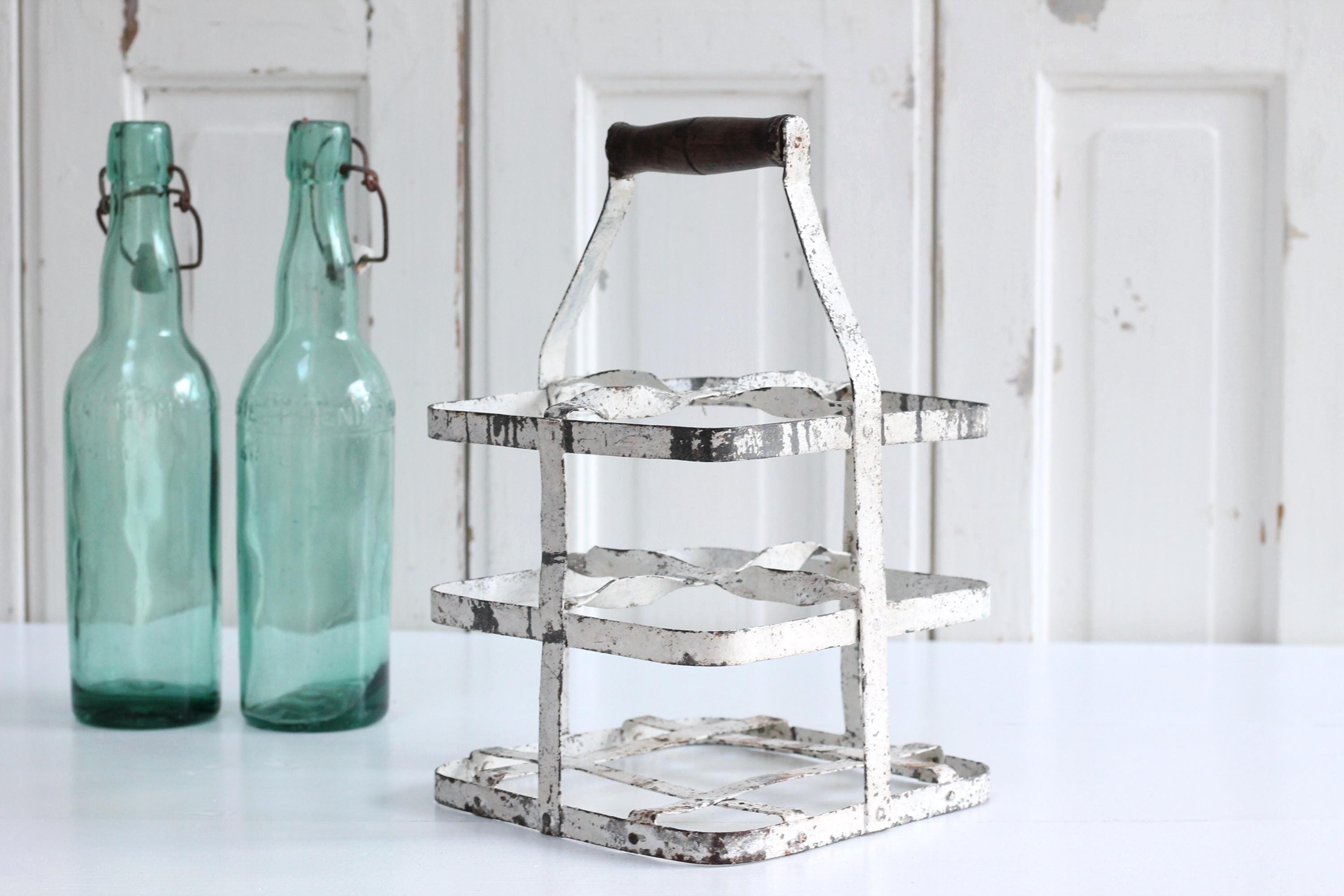 Antique French metal bottle rack with amazing white chippy finish. And a beautiful old wooden handle...