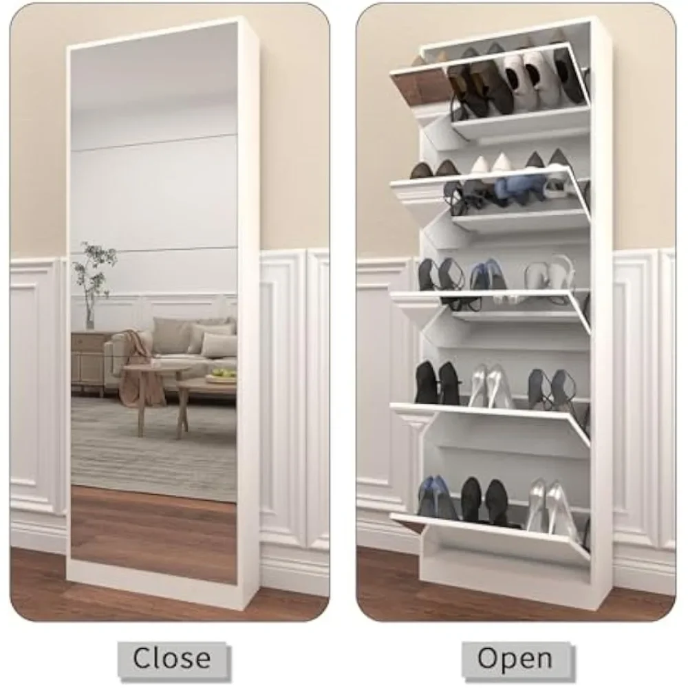 Shoe Cabinet With Mirror, Freestanding Rack Organizer, Five Flip Drawers Modern, Full Length Storage...