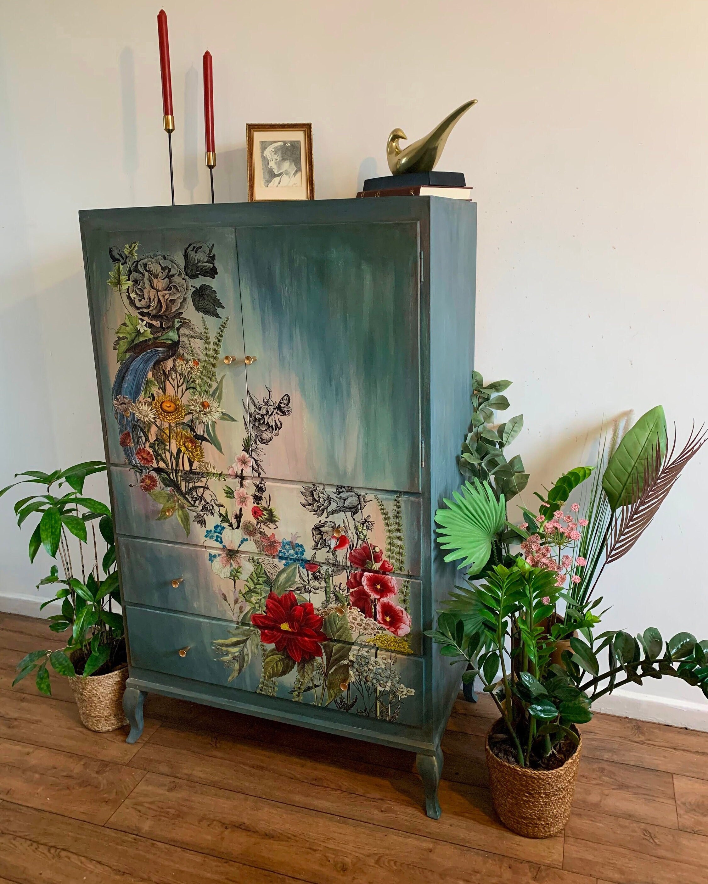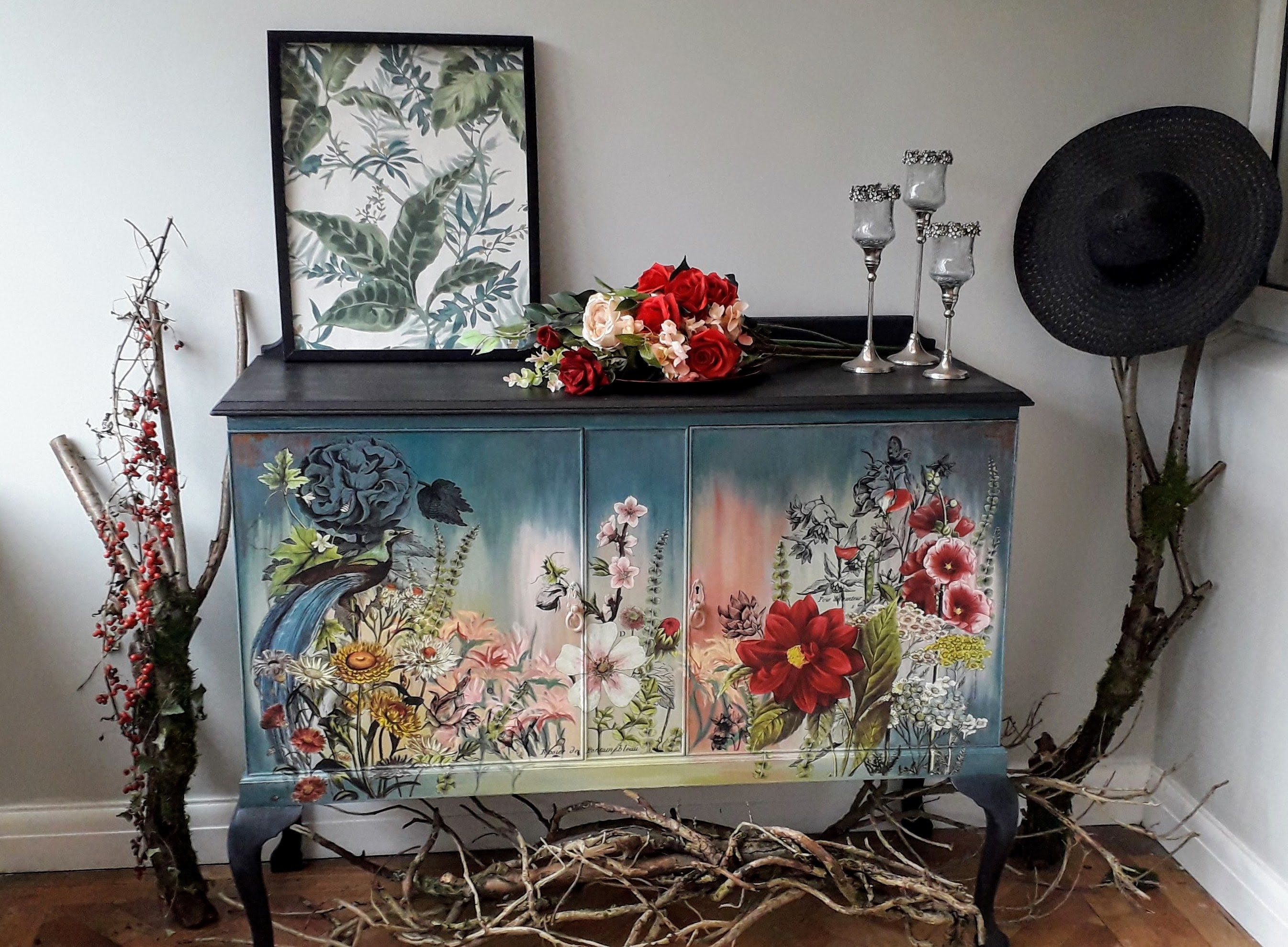 SOLD Upcycled Vintage Sideboard, Hand-Painted Midnight Garden Flora...