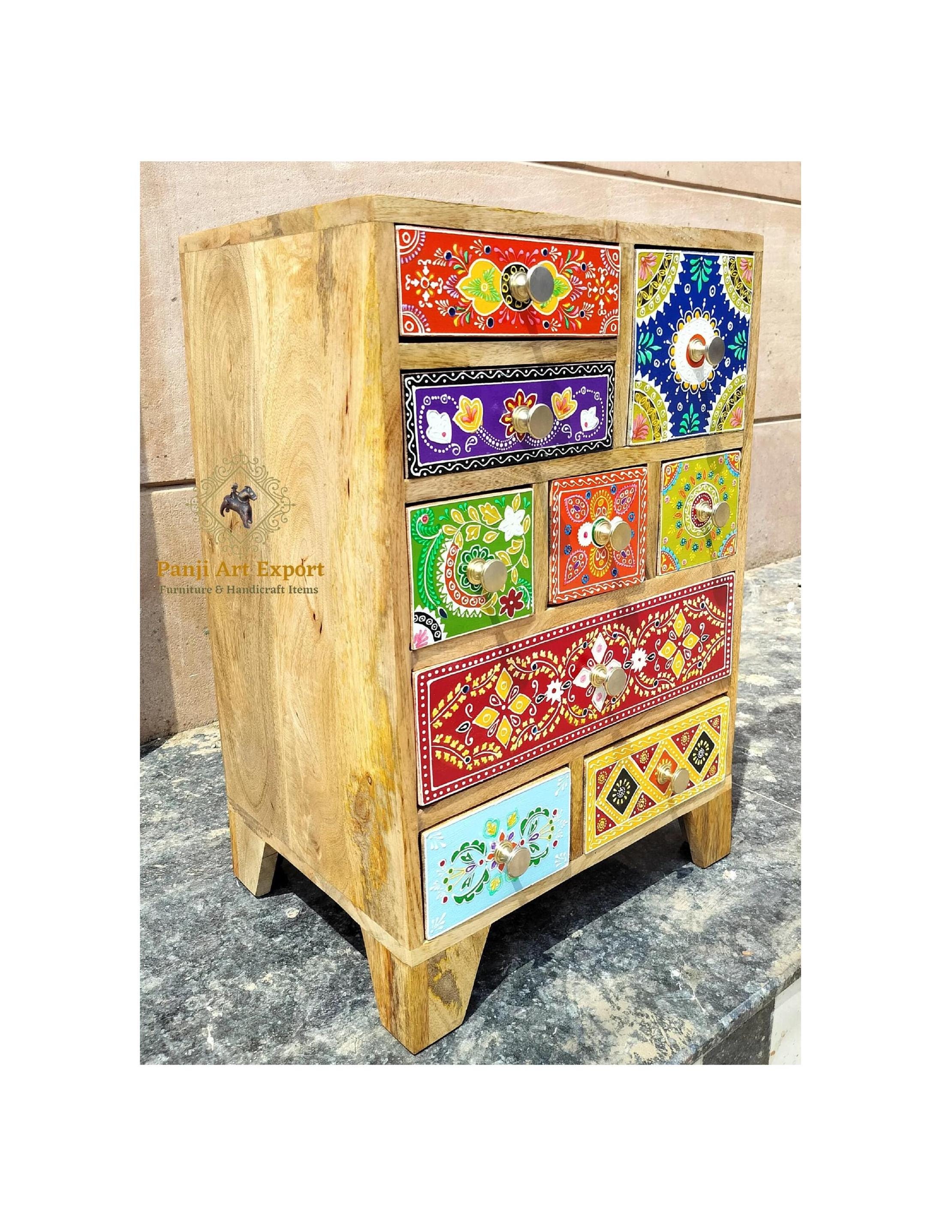 Handmade Indian Hand-Painted 9-Drawer Wooden Bedside Table