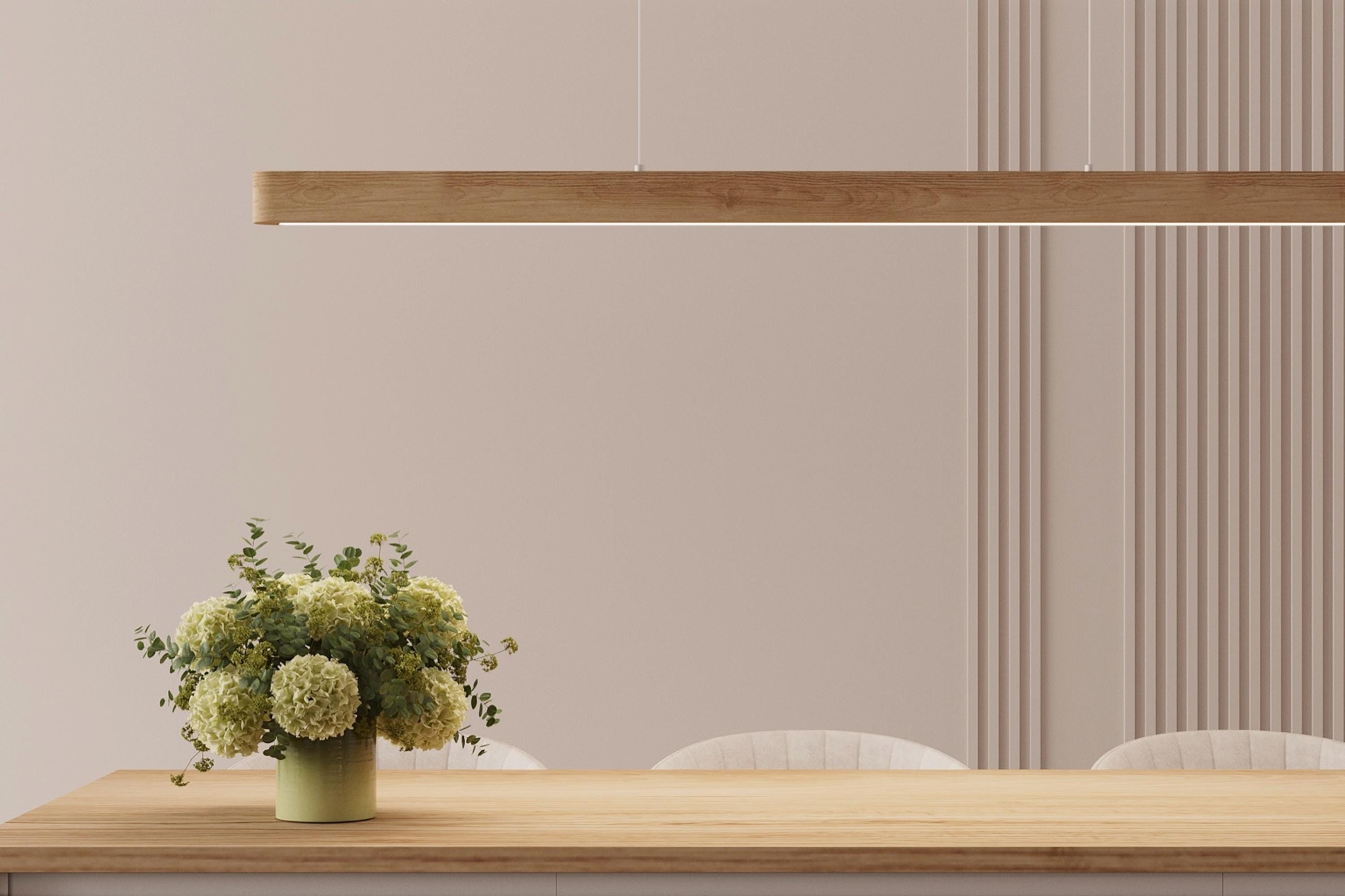 Elegant linear wood chandelier in solid oak, Dining table light, Ki...