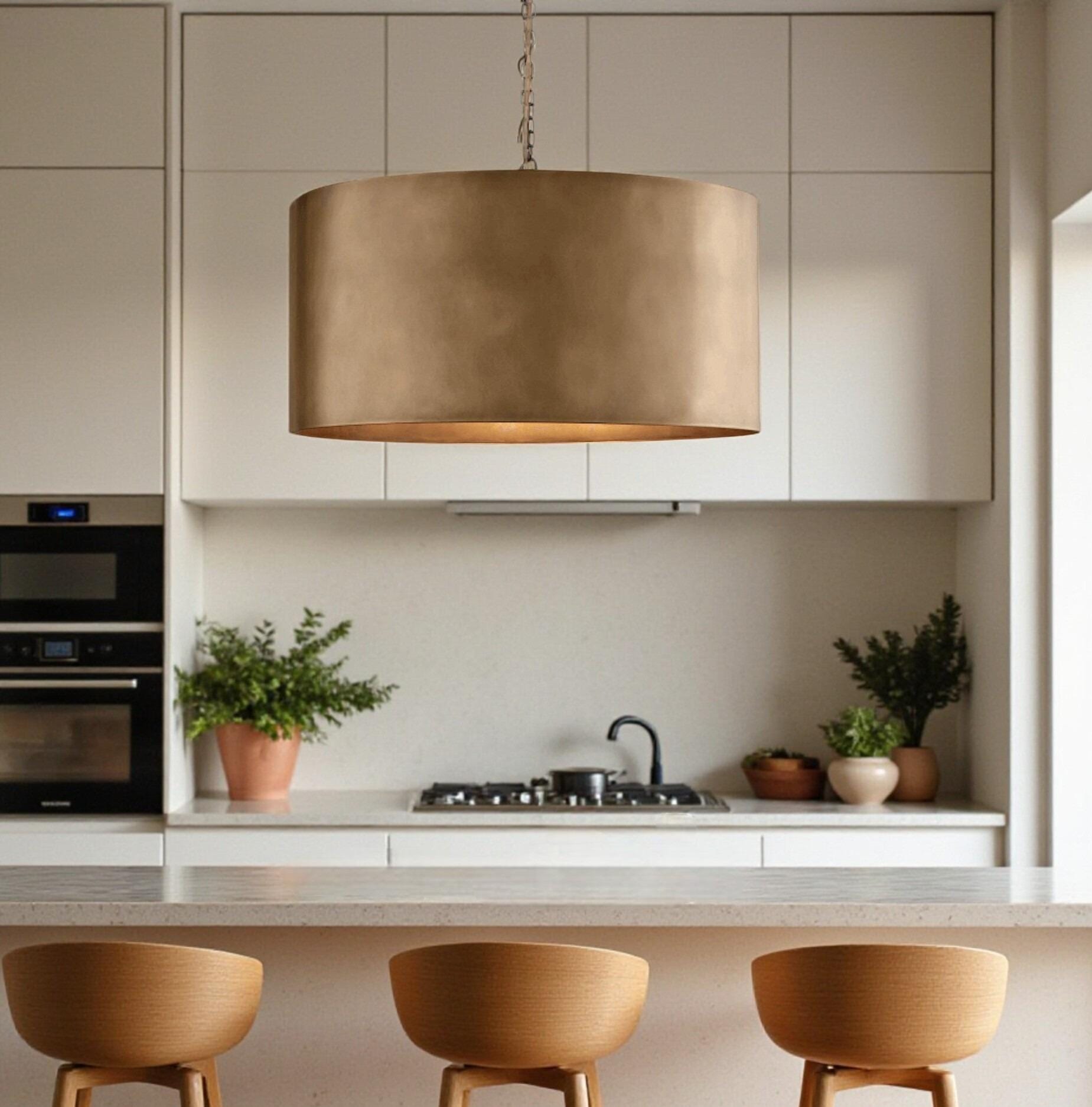 Bronze Drum Pendant Light - Solid Brushed Brass Hanging Lamp for Ki...