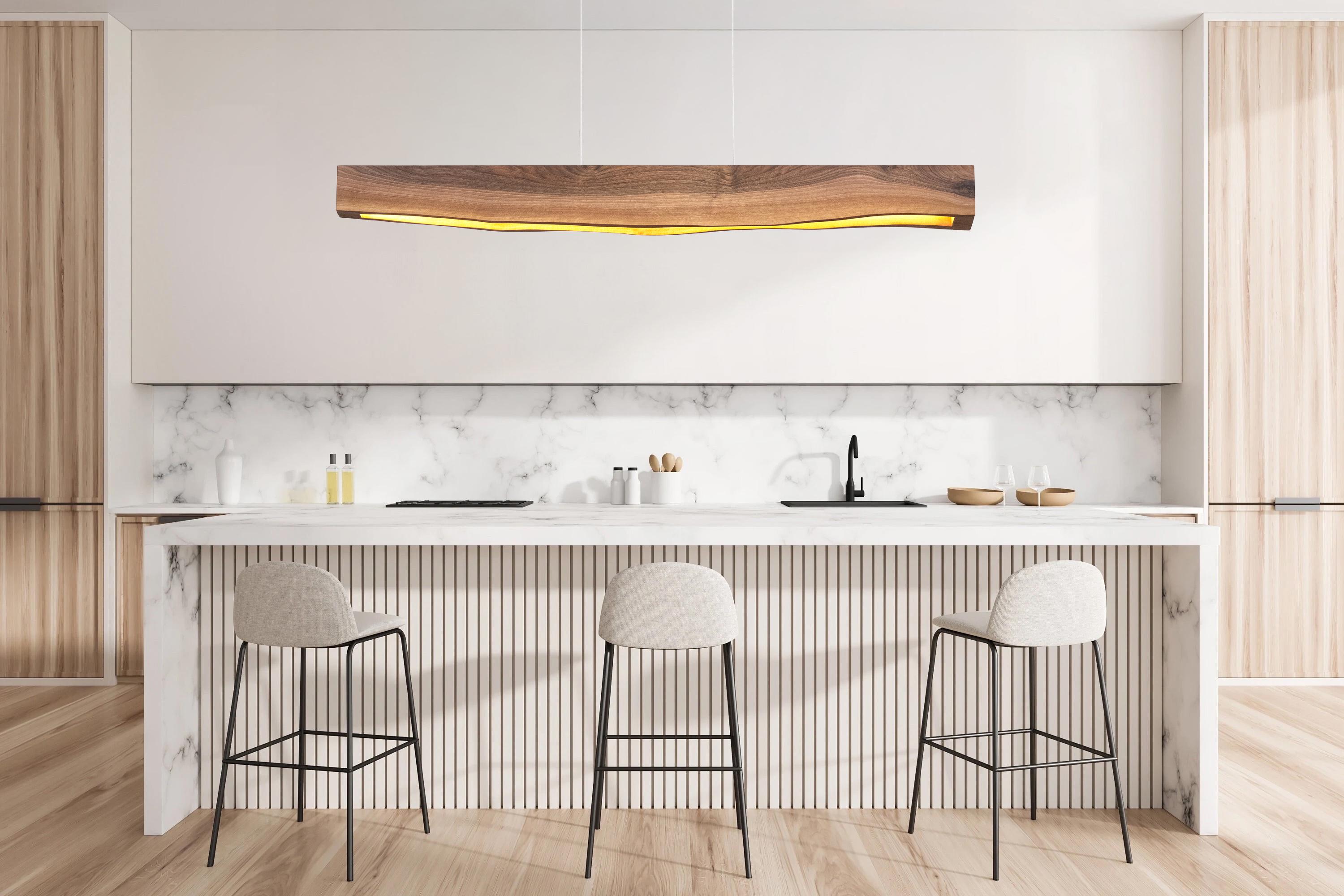 "Handcrafted wood linear pendant light in Japandi style, made from natural walnut. Warm LED lig...