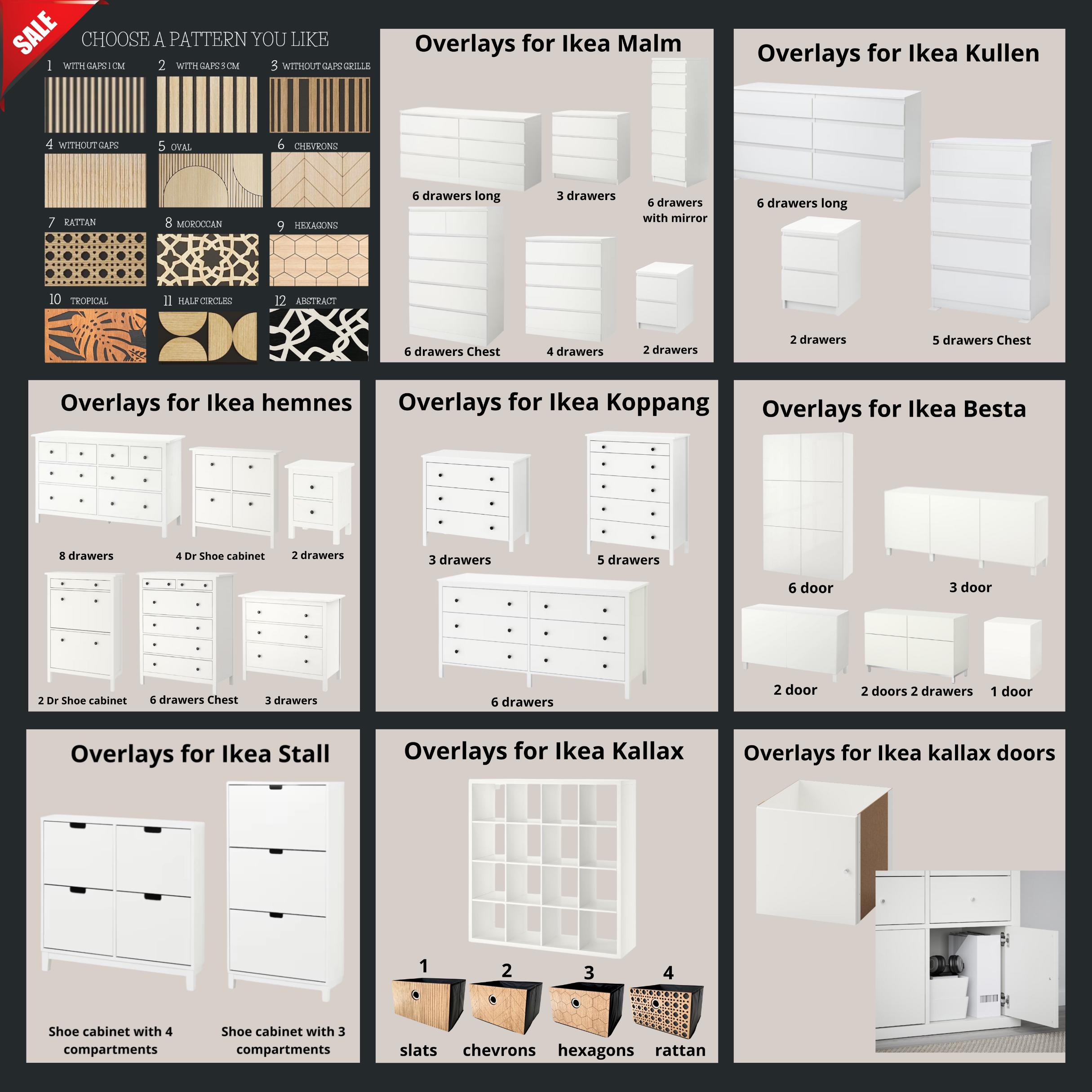 Furniture drawer overlays, wooden overlays, ikea malm, ikea besta, ikea hemnes, ikea kallax, dresser...