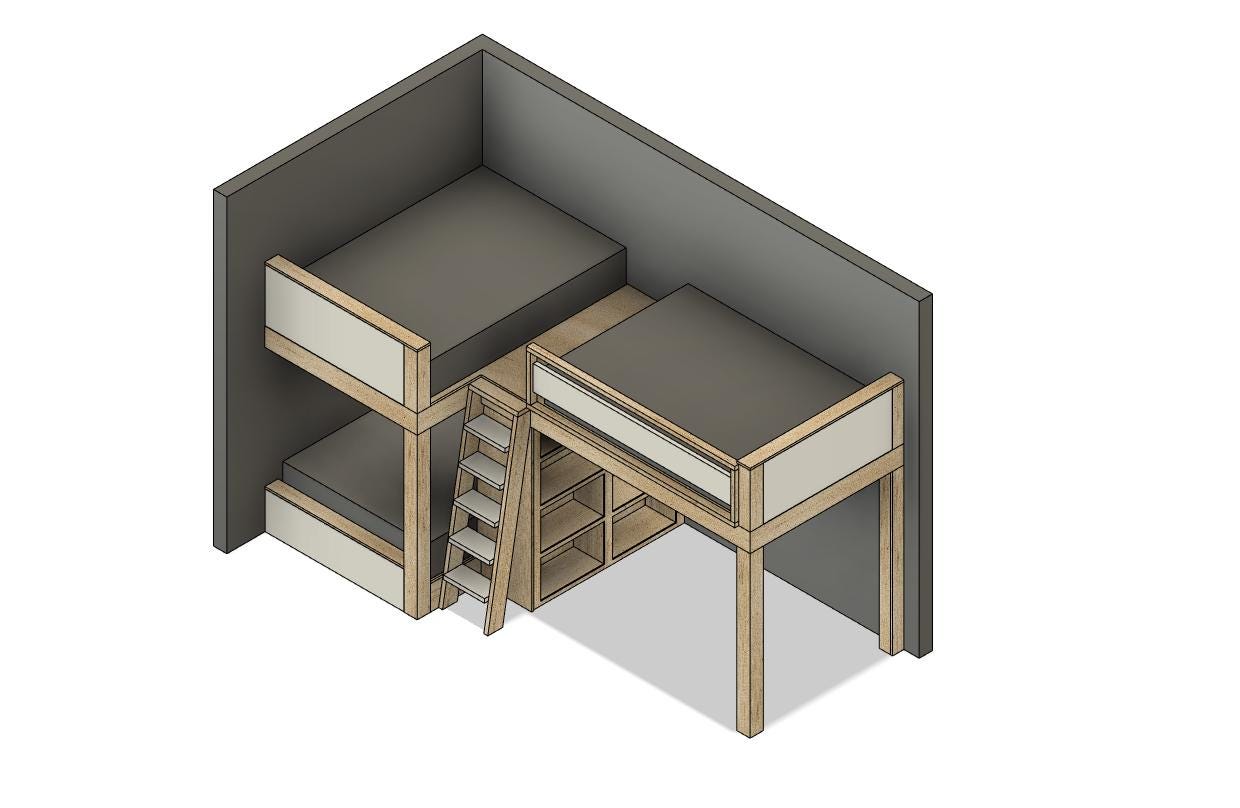 "Build plans for a L-shaped bunk bed. This bunk is designed as a triple bed bunk layout. All be...