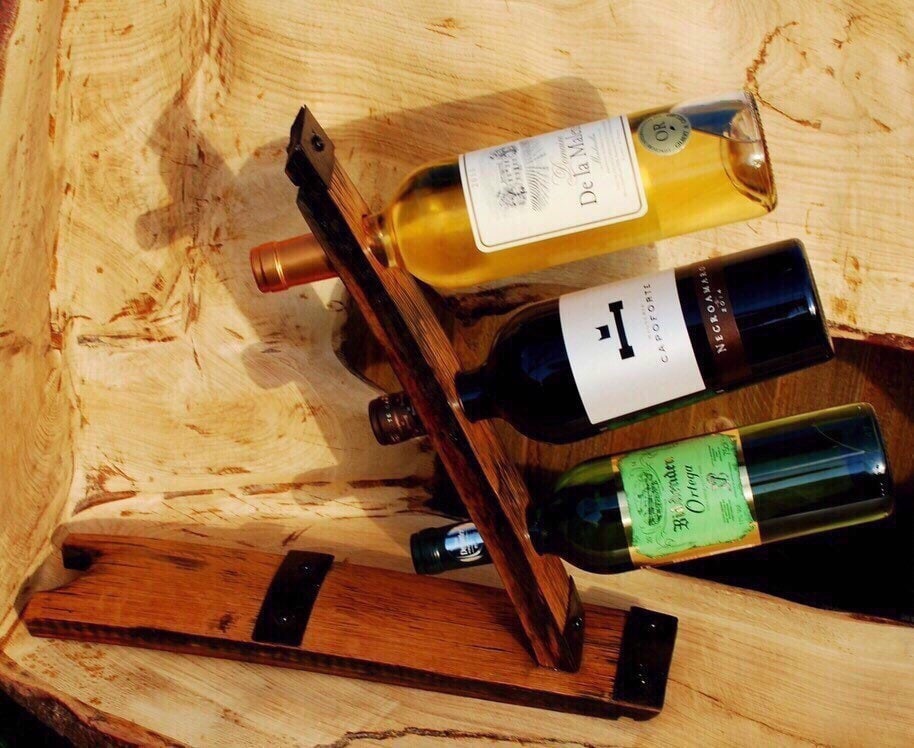 Wine rack made from old reclaimed whisky barrel staves, holds 3 bottles perfect for smaller spaces a...