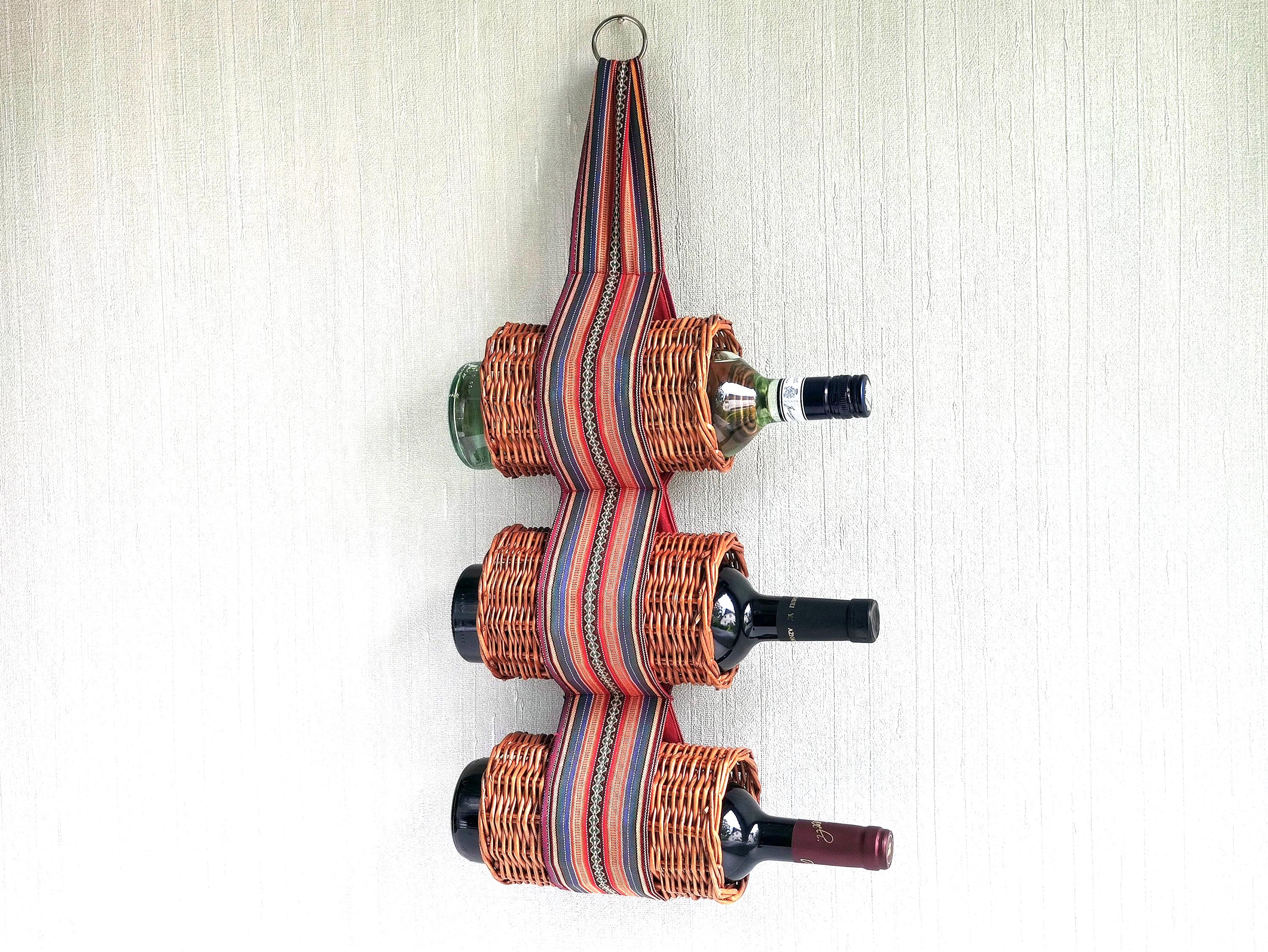 Beautiful vintage wicker wine bottle holder or towel rack. This is wall hanging wine holder for thre...