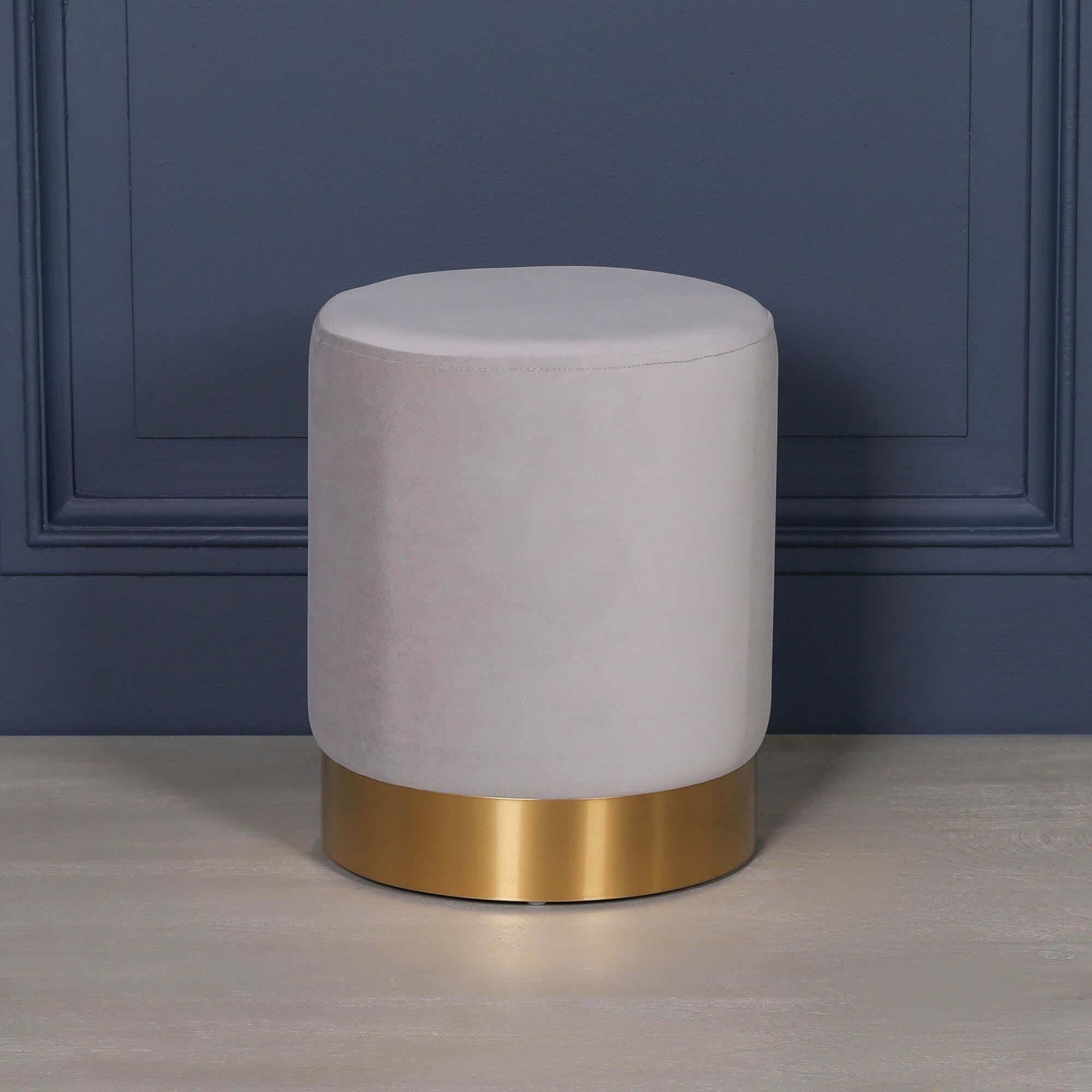 Light Grey Velvet Round Stool Pouffe With Gold Trim Base