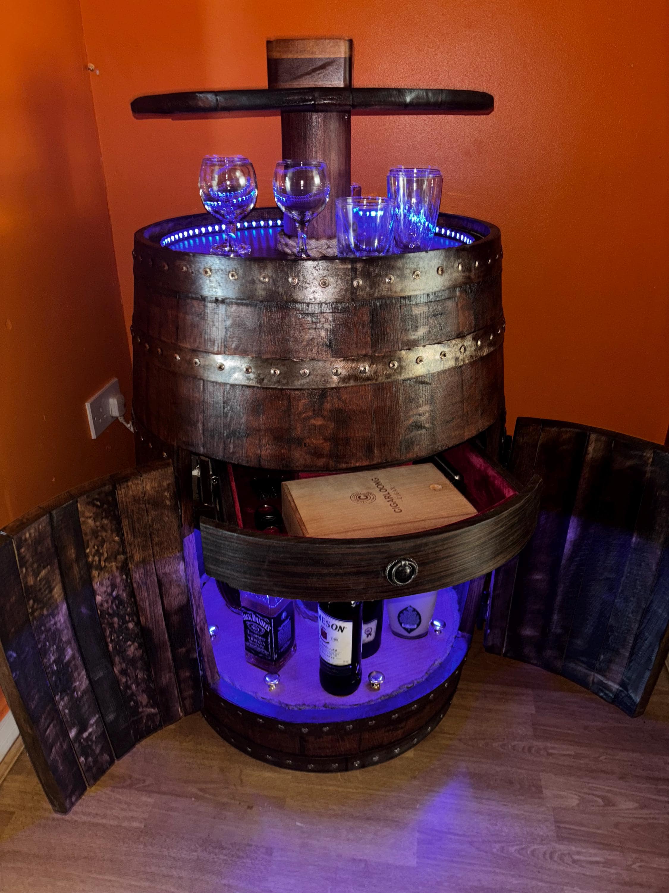 Made from a real used whiskey barrel Remote controlled lifting mechanism hides a large compartment C...