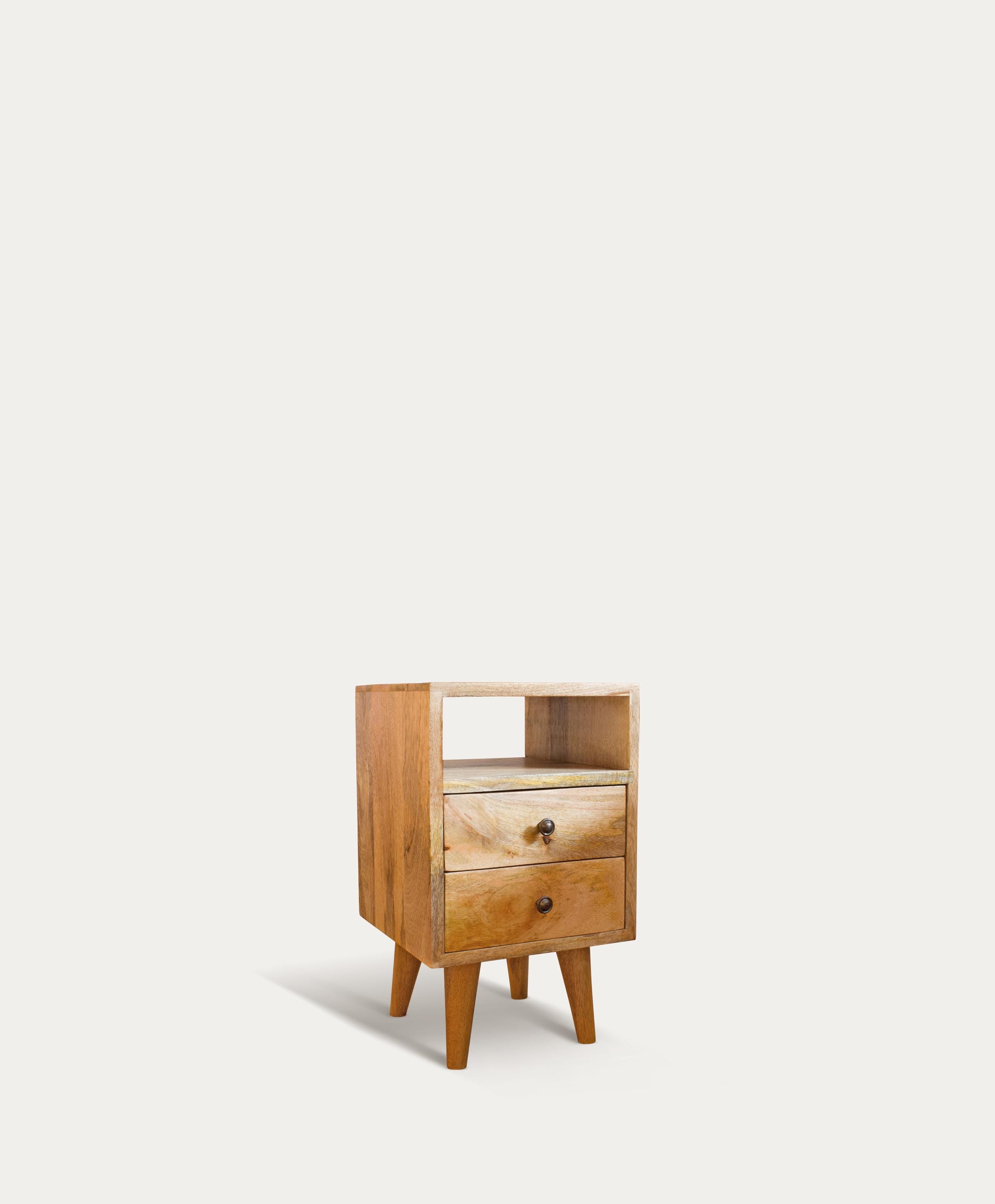 Our mid-century bedside table with curved drawers is attentively handcrafted from solid mango wood. ...