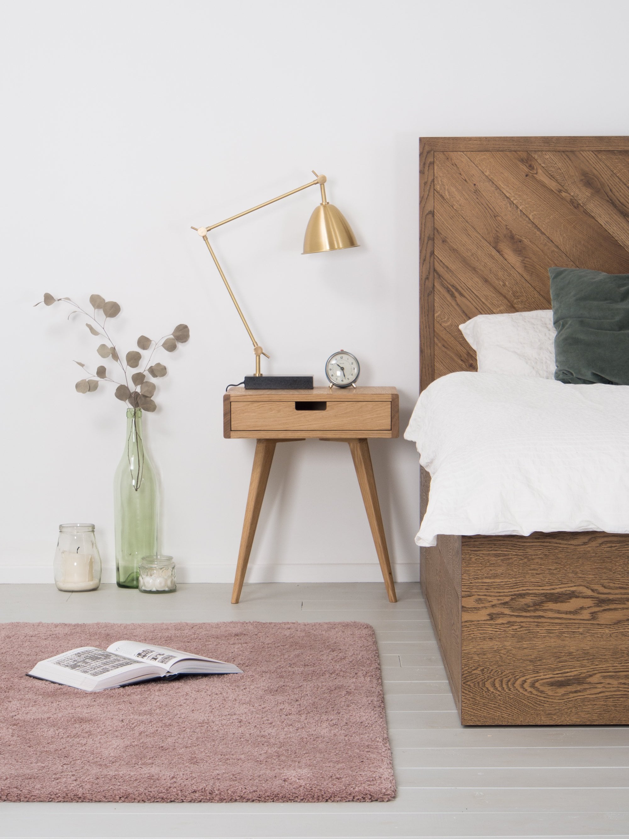 Mid-century style bedside table made and designed by me. The drawer structure is made of birch plywo...