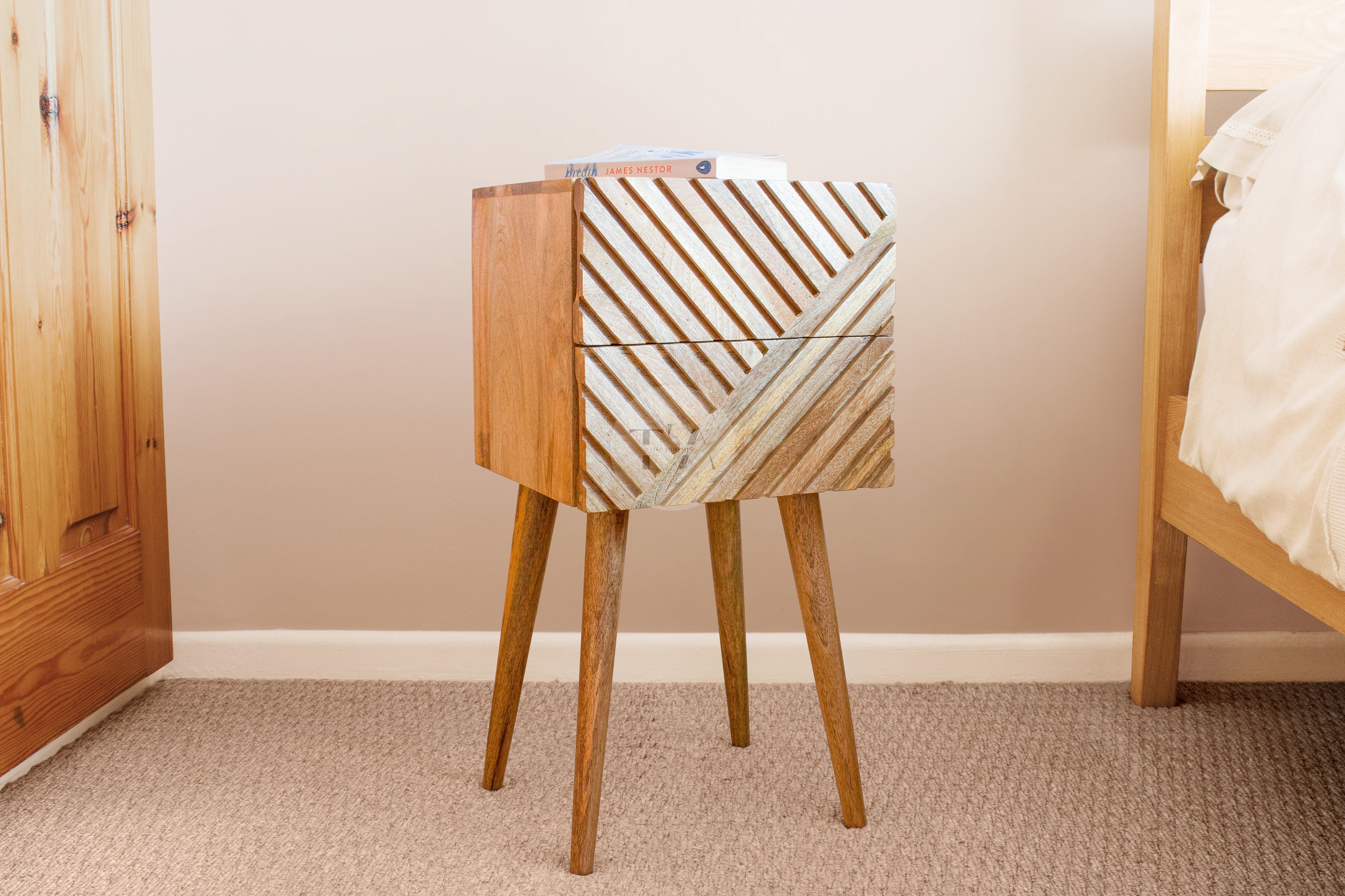 Our unique, tall, and narrow mango wood bedside table features a cube design with wooden line-carved...