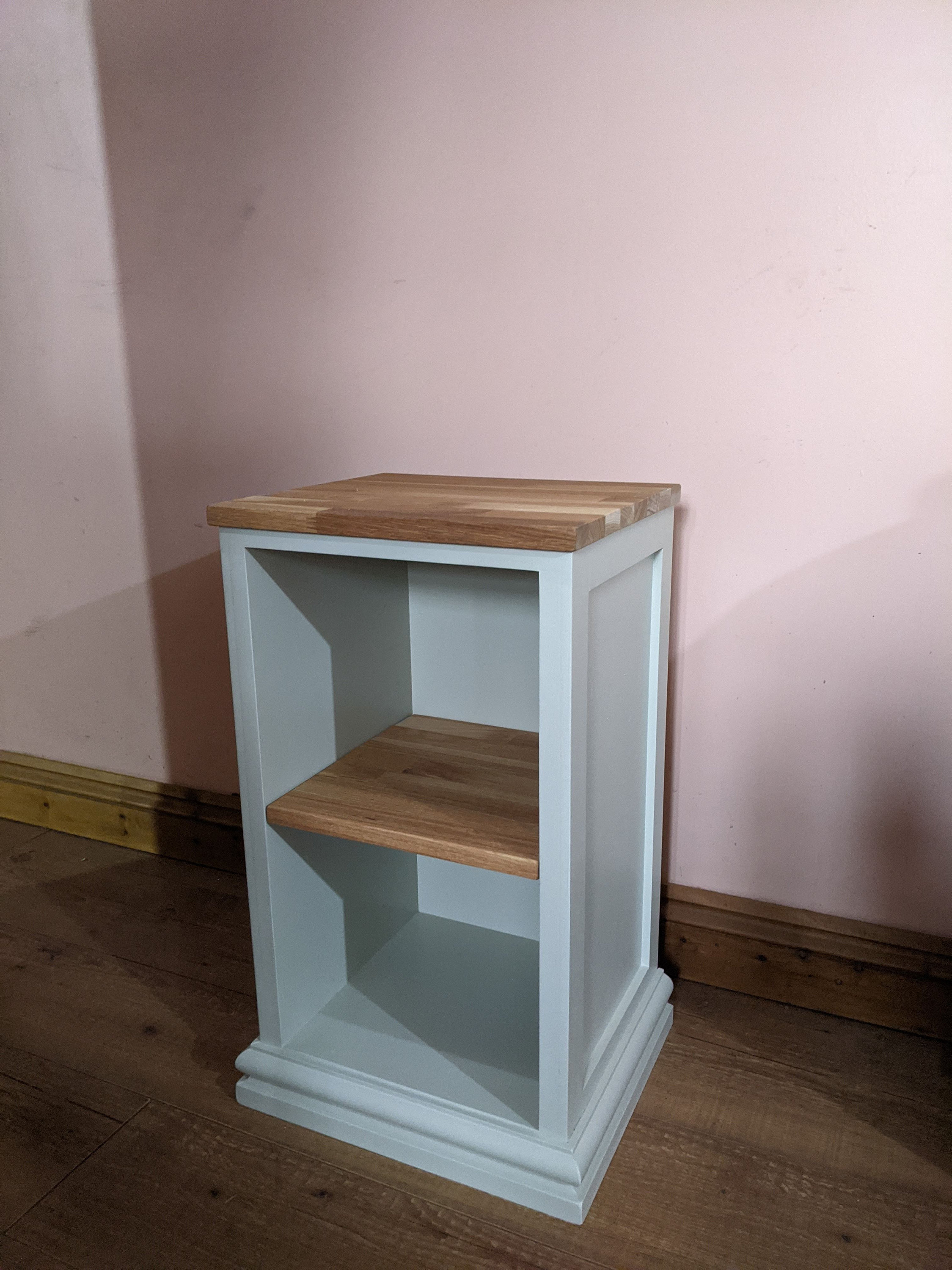 Painted bedside table with oak top and shelf