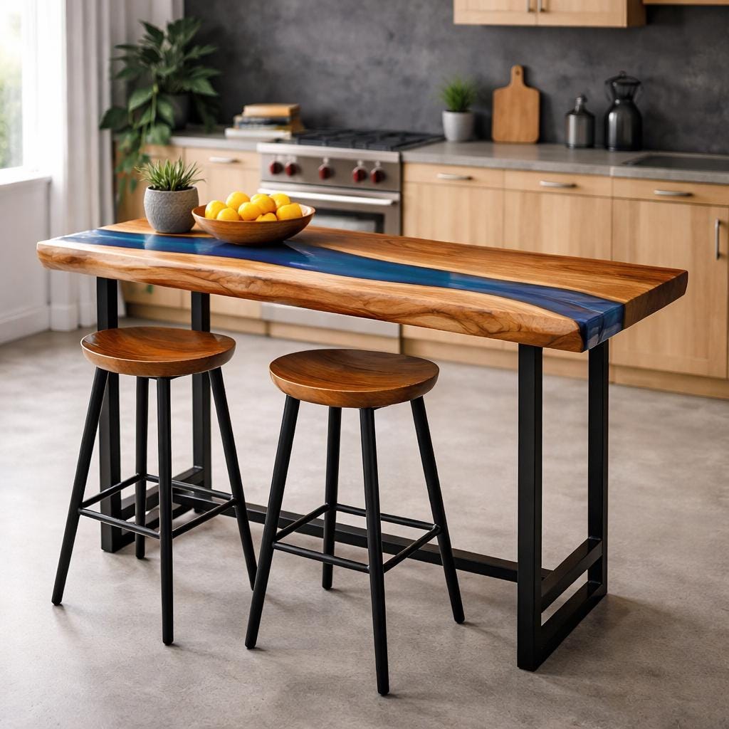 Kitchen Bar Table, Live Edge Oak Breakfast Bar with Blue Epoxy Rive...