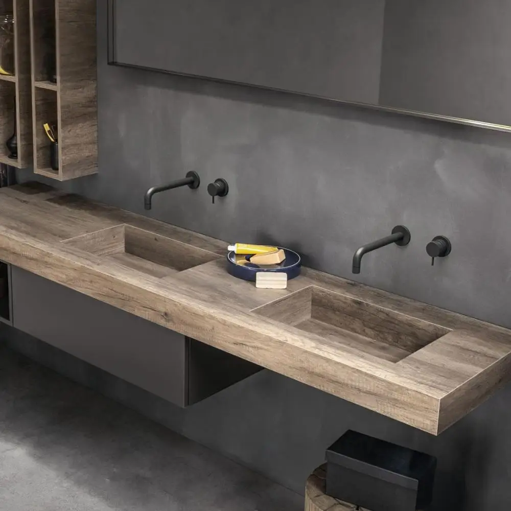 Mid-Century Wall-Mounted Double Vanity: Oak/Walnut with Marble Luxu...