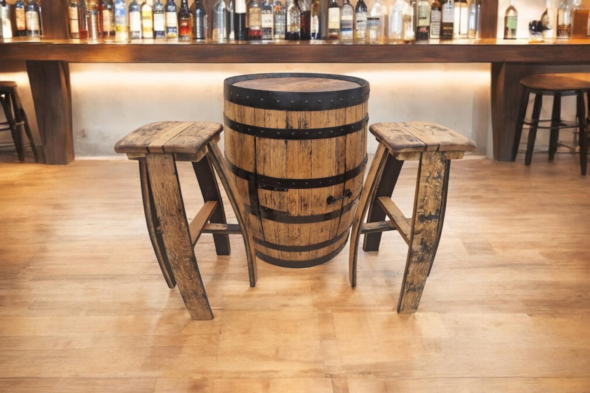 Oak Whiskey Barrel Cabinet Table Set with 2 Bar Stools | Reclaimed ...