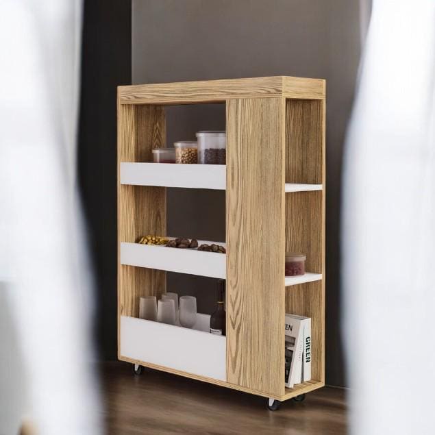 4-Tier Slim White & Oak Wooden Rolling Kitchen Trolley Cart wit...
