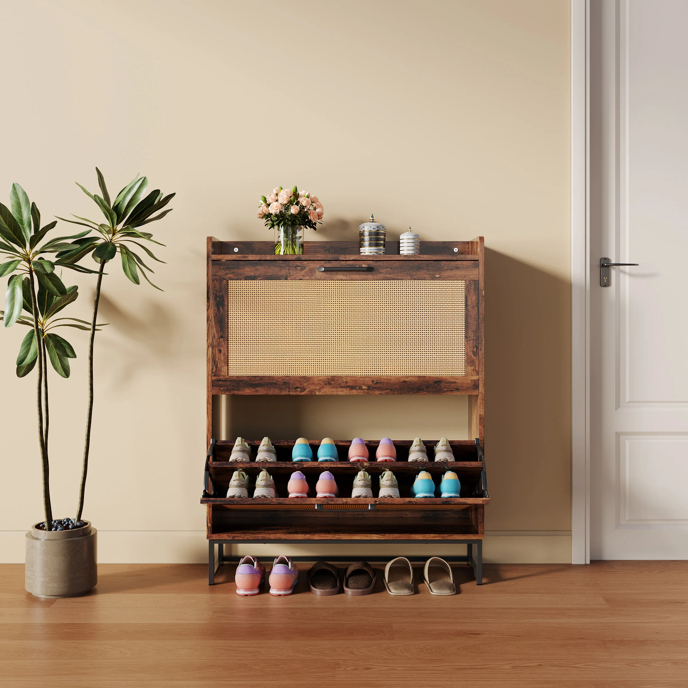 Sliding dustproof shoe cabinet, large capacity wheeled side pull sh...