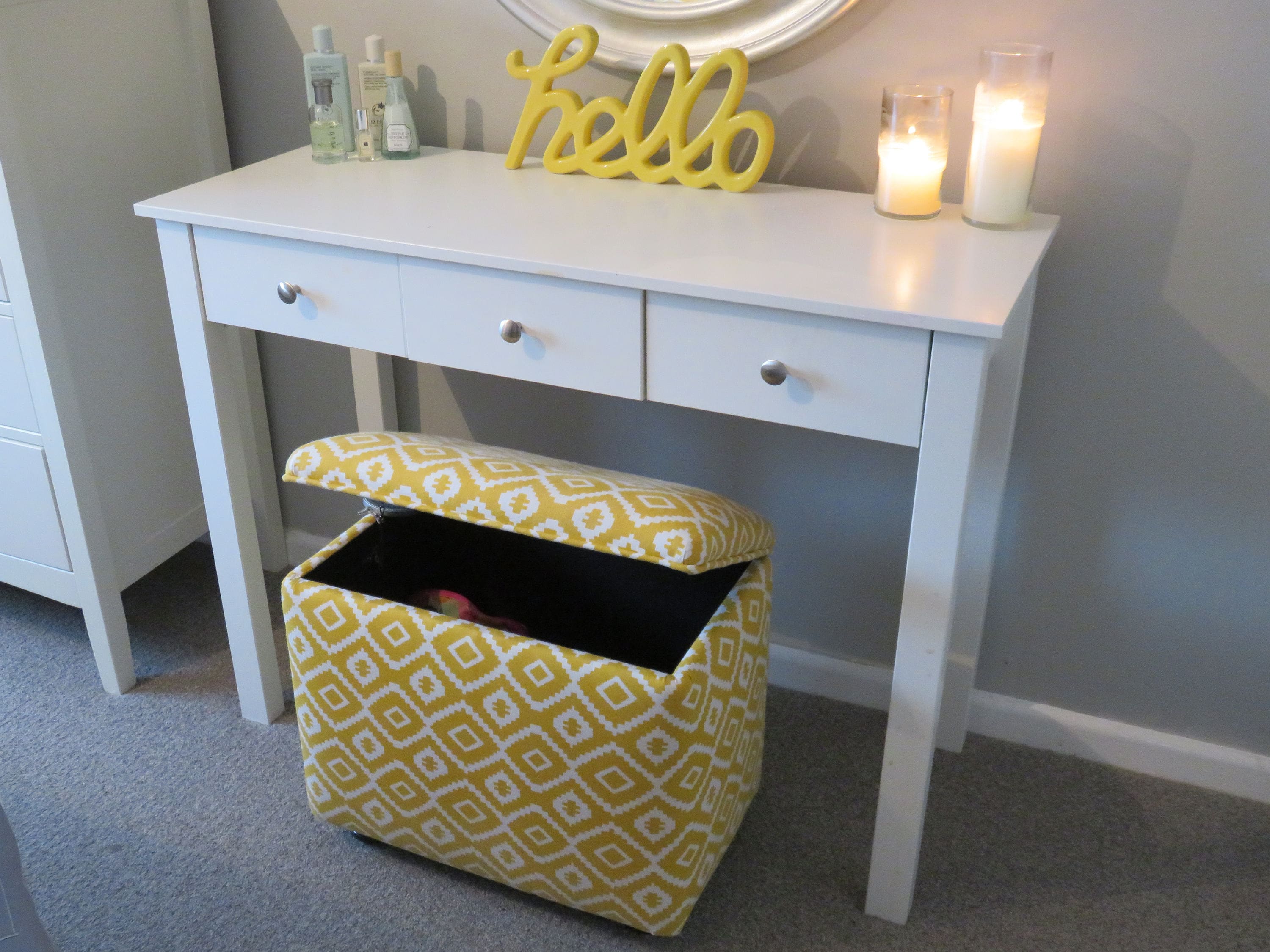 "Beautiful handmade upholstered dressing table stool with storage, super handy to store your ha...