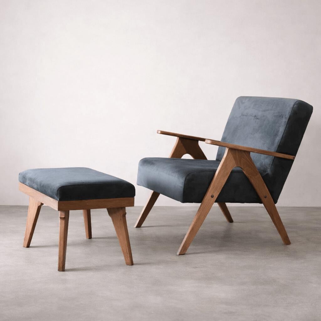 Handmade mid-century armchair and ottoman set in easy-to-clean gray fabric with a solid beech frame....