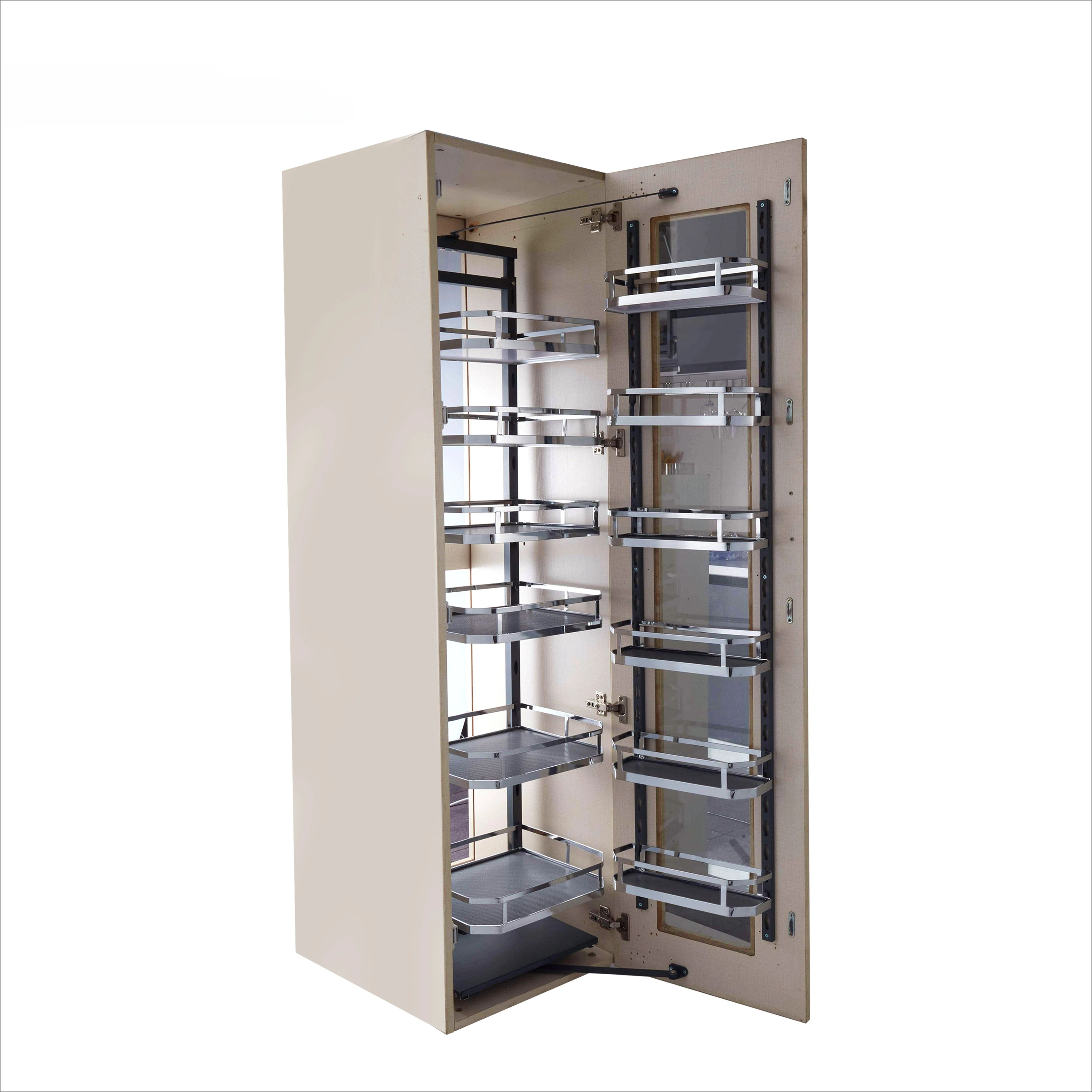 Modern 6-story kitchen organizer with chrome steel and wood cabinets inside pull-up pantry unit with...